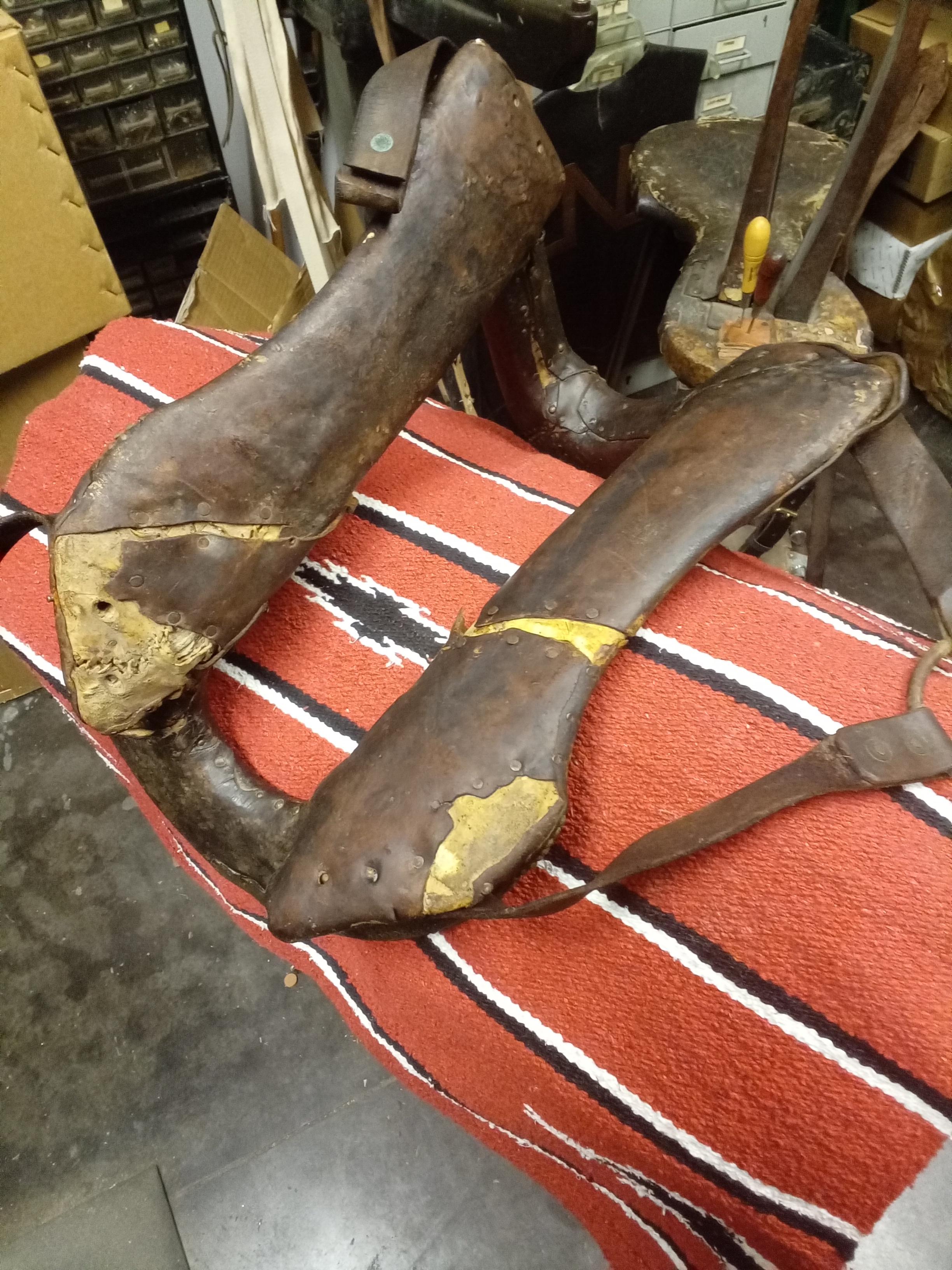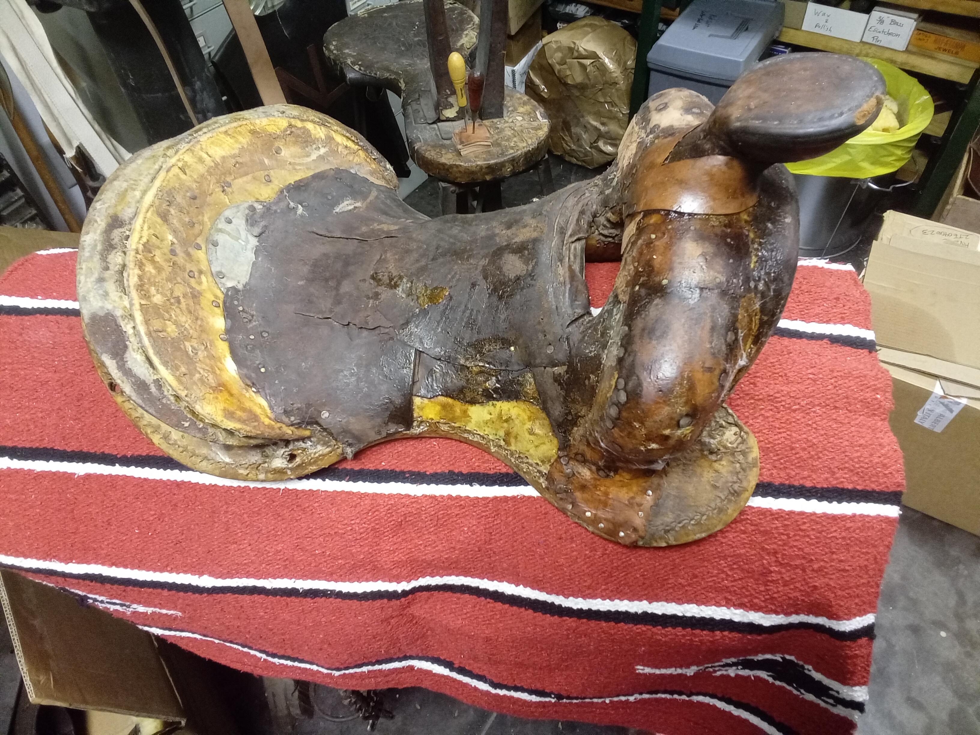 This is one from my Dad's collection. He always called it a "squaw" saddle (no offense to native Americans meant), though I don't know if that's the proper name. I'm not sure where he picked it up but it's old. He had a knack for collecting old western and ag paraphernalia mainly from the American southwest and rural west coast, and he also was around a lot of it during his years doing props and special effects in Hollywood, as he would buy or was given authentic artifacts to study or duplicate for film, and this could be one of those pieces. It appears to be a wood tree, wrapped in rawhide, and then wrapped in leather, with brass dome tacks added for embellishment. They also likely add some wear resistance on the edges. The rigging straps are held on with screws, but I think they are a later repair. The brass tacks seem advanced for a natives saddle? I'd be interested if anyone recognizes what culture, area, time frame, etc. this saddle is from. I have no intention of restoring or selling it. Periodically it comes down for a cleaning and soaping, bit otherwise it stays on the wall.