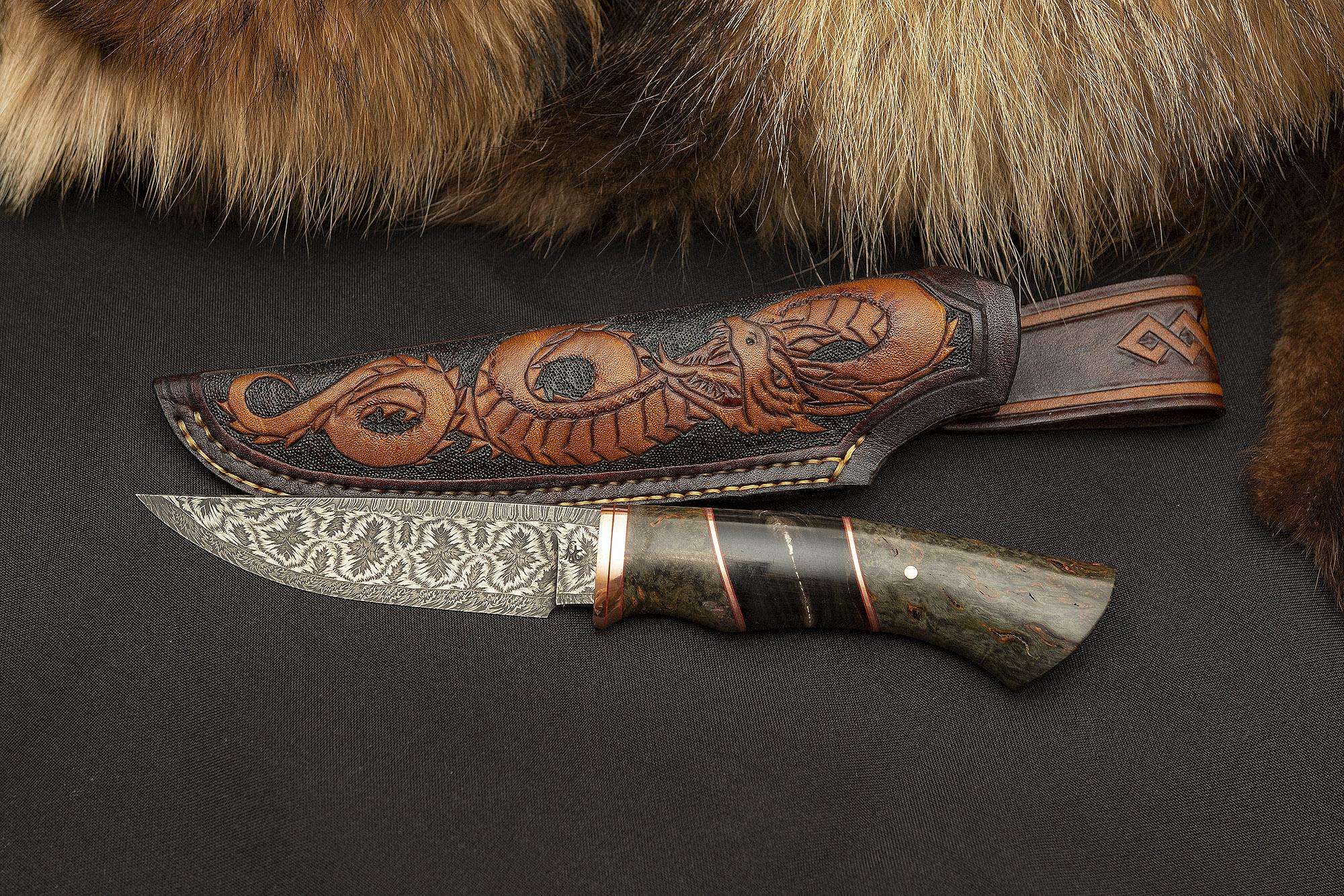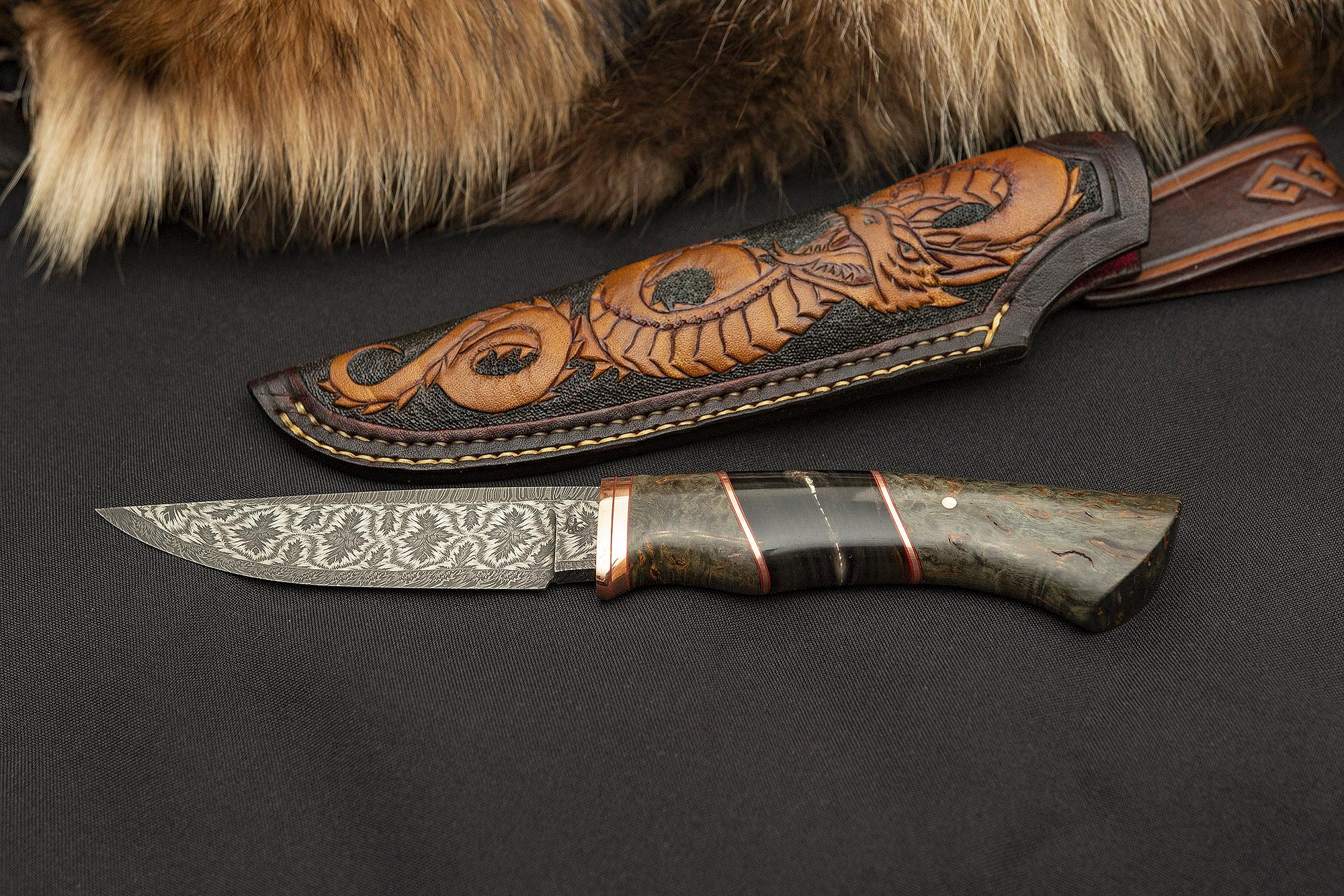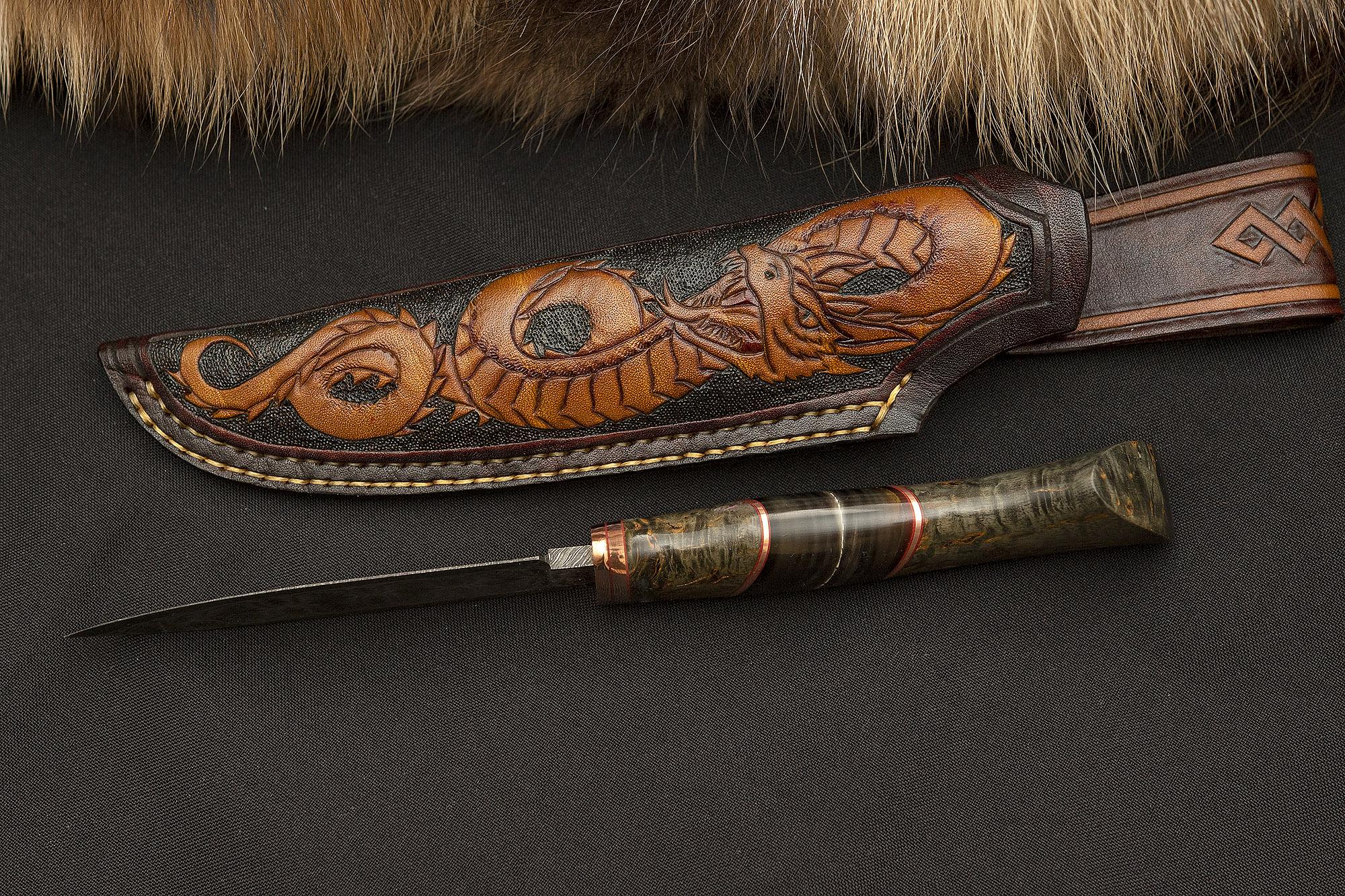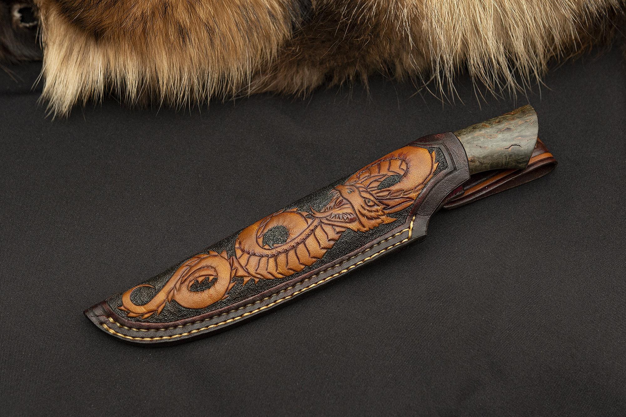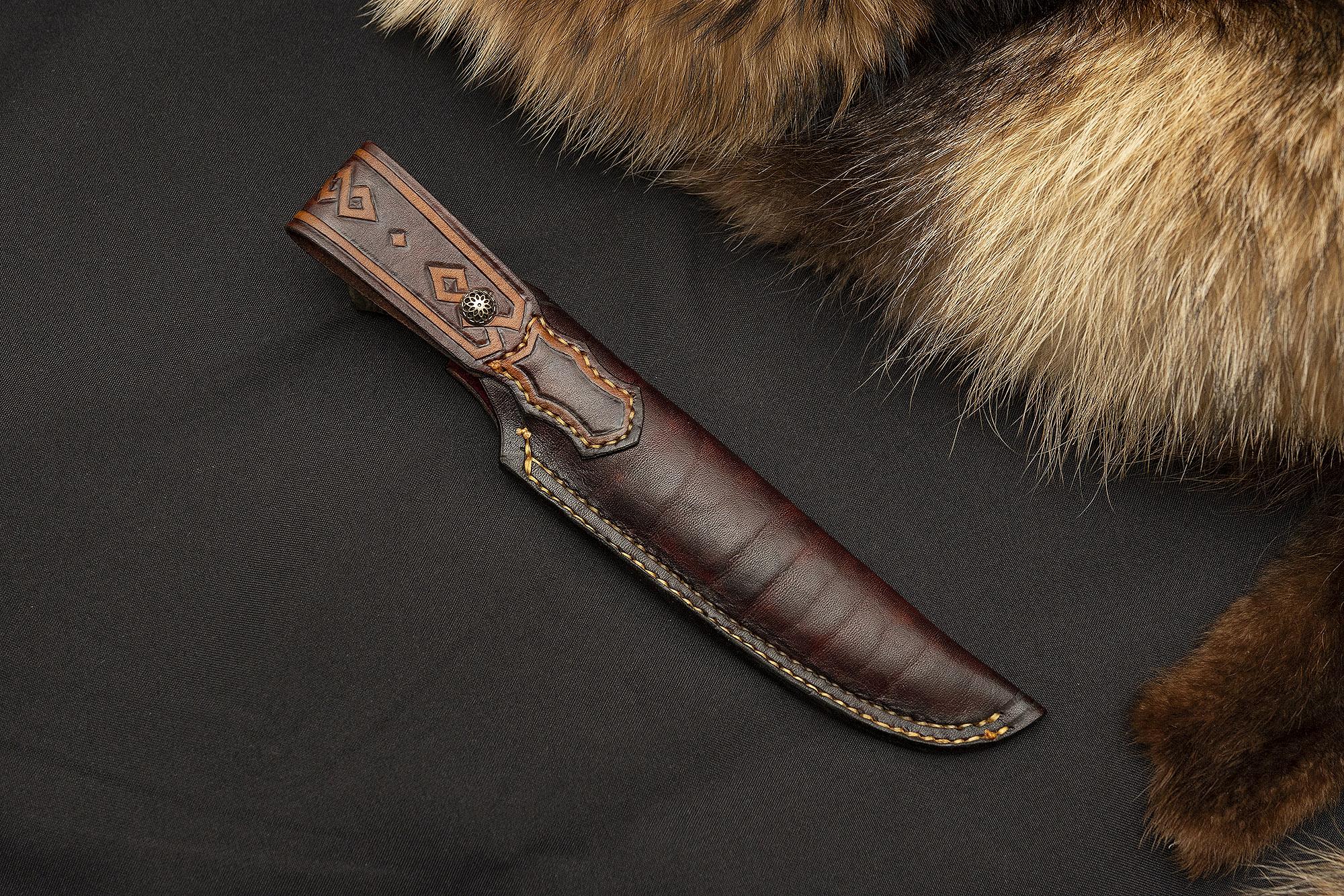 That is very nice intricate work on the sheath. Is it hand sewn? Very interesting pattern your knife blade too