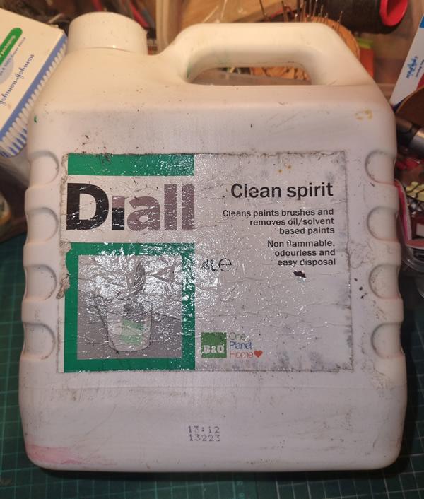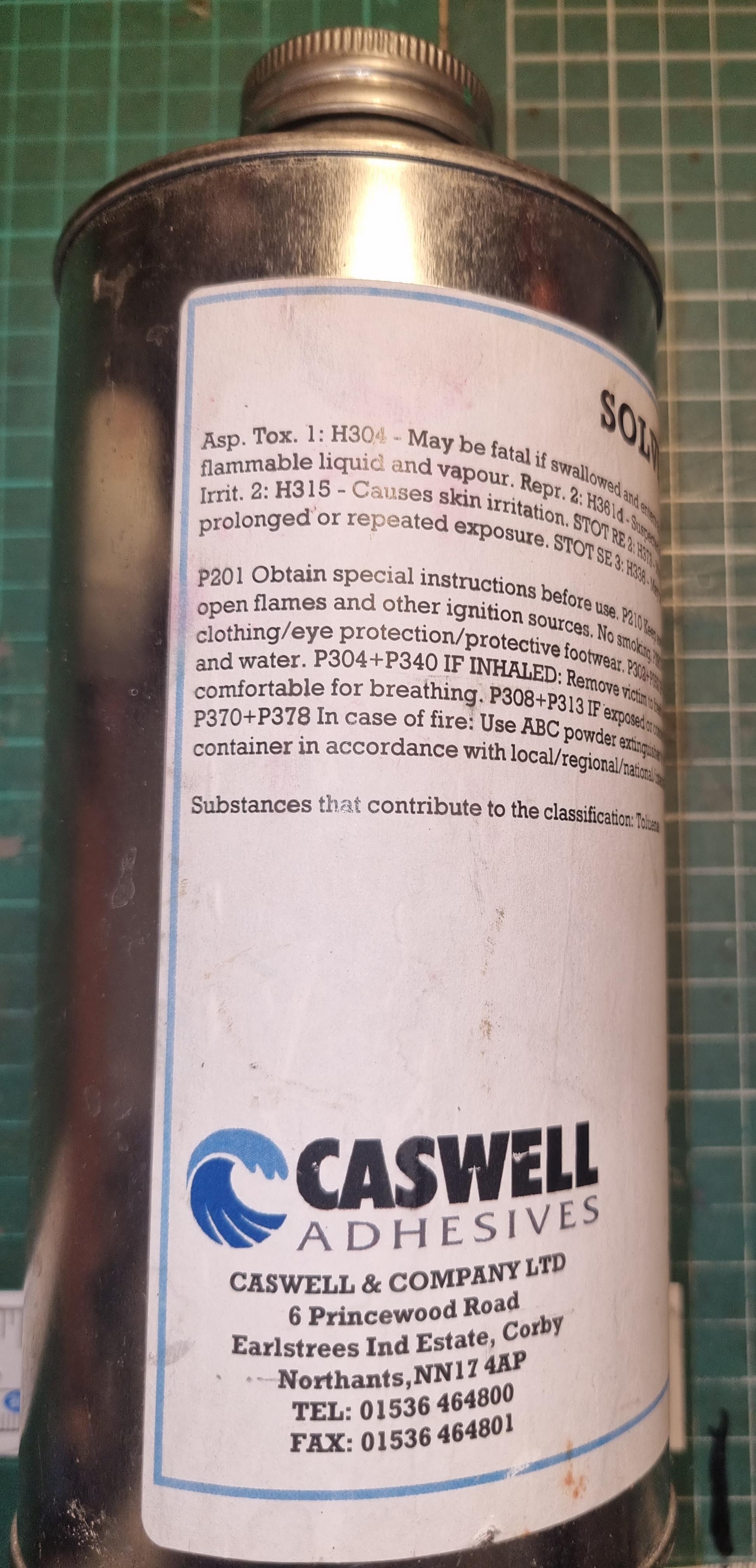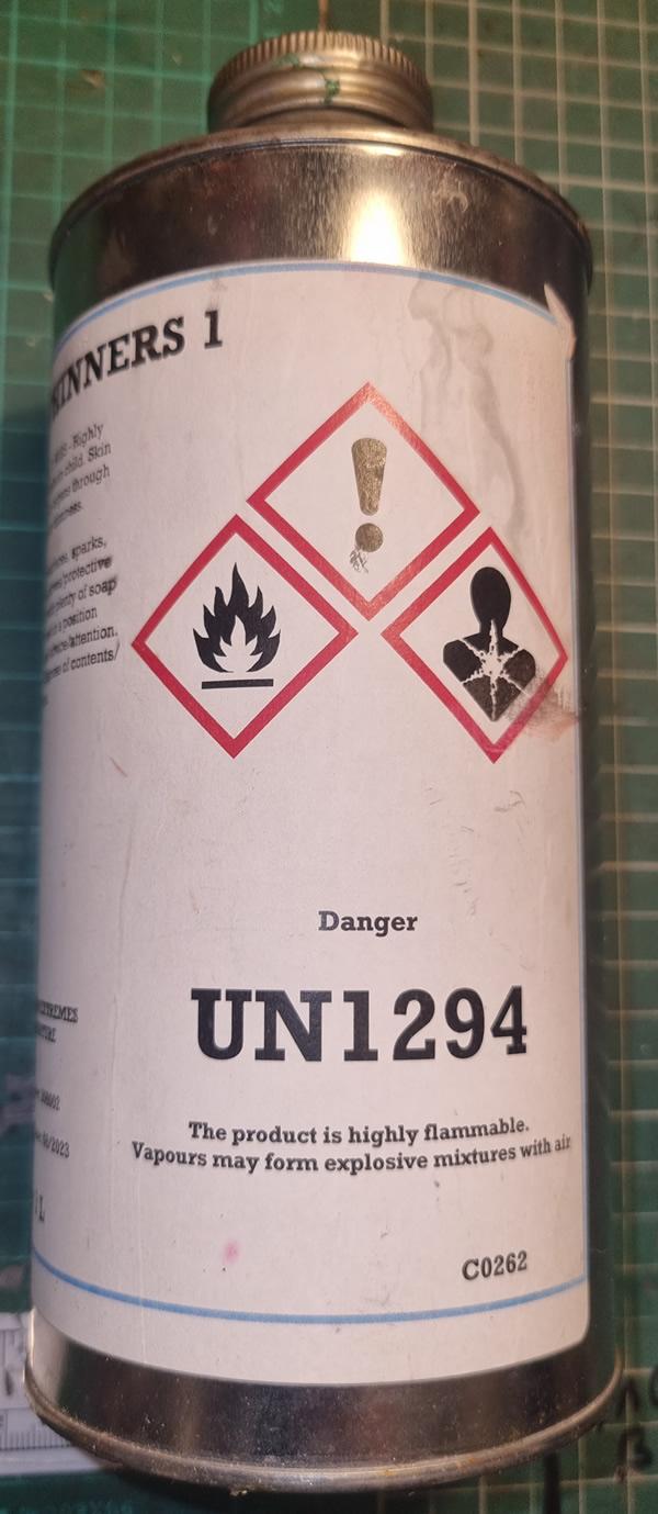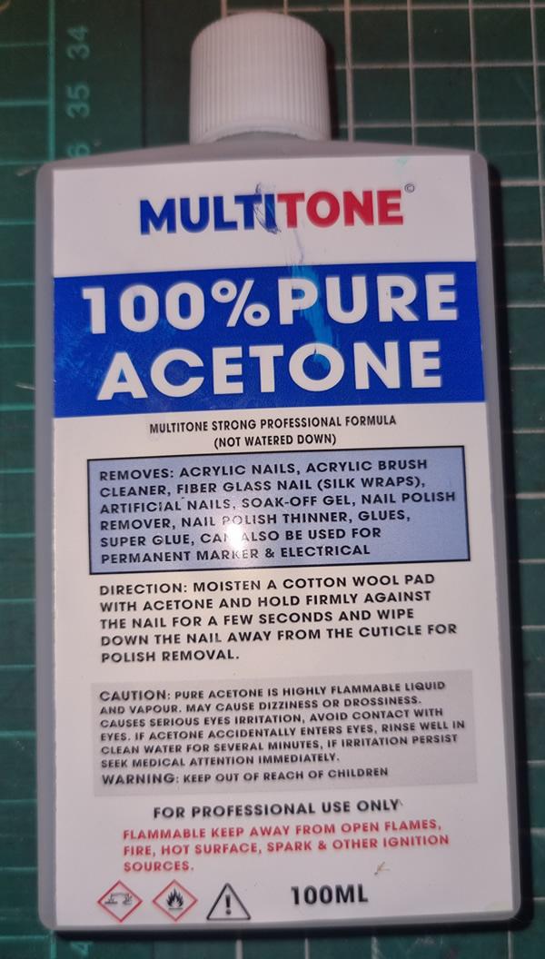I'm never sure which one does what! I'll try one after the other until it gets the job done. I'll always try the thinners first, the toluene usually does it. This is the one I use to thin the contact stuff. I don't use it often so I'll usually pour a little if this on top of the glue before I put it away. It is an animal though, The other day I found a small plastic glass that I had left a glue brush in with some thinners was just a puddle. The white spirit is best for removing the white leather marker lines. Acetone is last.