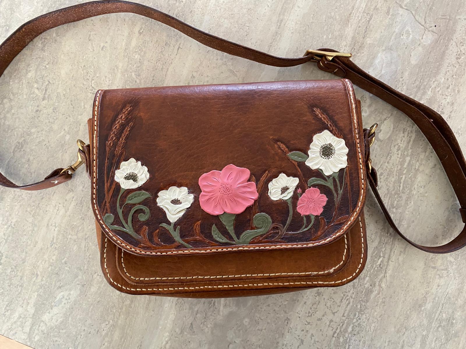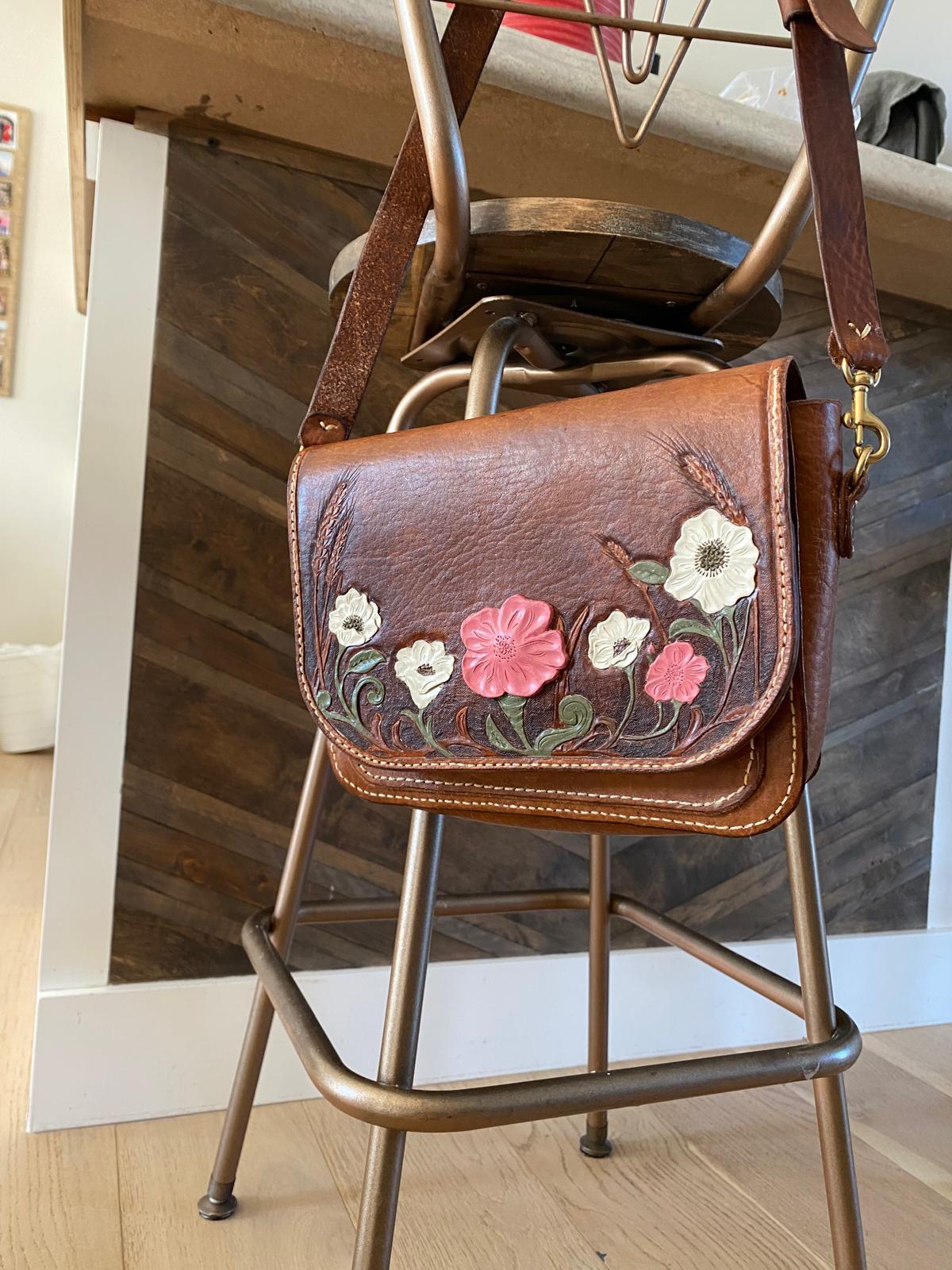 This is my first tooled bag and one of the first tooling designs that I have made by myself. The wheat and wild roses were included to reflect the Albertan prairies where the client lives. Solid brass hardware; the bag is finished with mink oil; and the tooled piece also finished with resolene to try to preserve the painted parts. The leather is bought from an old style Mennonite community in Belize, where I suspect is was made. The pattern was modified from Retro Leather Goods' leather saddle bag pattern. This project has taught me to use antiquing gel! Tooling takes too long to not use the proper product. Any thoughts, recommendations, or critiques? I would like to know how I can improve. Thank you.
