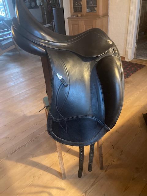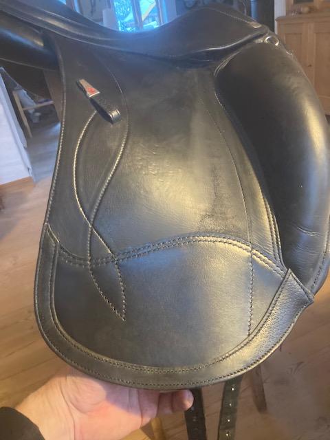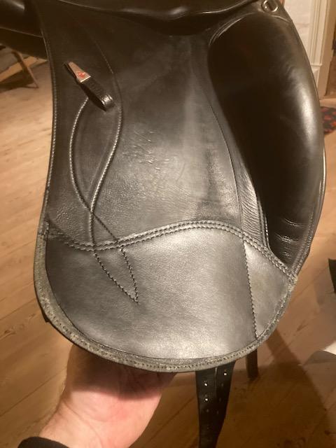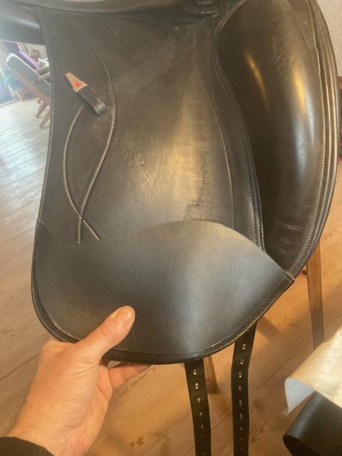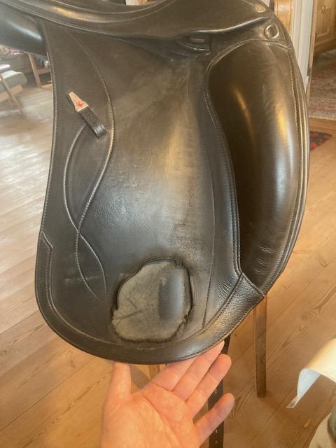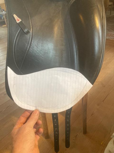 This time at home, one of my customers asked if I could repair the saddle flap of an Equipe saddle, where the outer layer of leather had been worn through. She had bought the saddle second hand since it fit both her and her horse perfectly, so she is not the one who has managed to wear the saddle flap to this extent. Actually I am kind of puzzled as to why it was only worn through on the right hand side of the saddle, but the left side had just a bit of normal wear, so either the previous owner must have had used her right leg more, or perhaps have used some abrasive things on her right leg, like an unprotected zipper? For once I have managed to take pictures through the process, to help giving an idea of how I did the repair job. In total the job took 8 hours, so it is not a super fast job, but I never expected it to be. The value of the saddle still makes it worth making a repair like this, and difficult work holding/handling and hand sewing is the main reason for the time consumption. If I had a cylinder arm walking foot sewing machine, I might have been able to pull it off a bit faster, but I am only guessing. A saddle is fairly awkward to move around, and It only takes one slip to make the stitch line look bad and making matters worse, so I think that I would probably still go with hand sewing in this case. 1) outer layer of thin leather on the saddle flap is worn through. 2) A pleasing curve shape was cut on some paper. The inspiration for the curve came from the sides of the seat, and I wanted the ends to correspond to the angles of the lower reinforcement piece. 3)The curve is lowered to show the corresponding ends of the lower reinforcement piece. 4) A piece of thin leather (approx 2 mm thick) is cut out in the correct shape. It is deliberately made so that the lower part leaves a 3/8" gap towards the lower part of the saddle flap. (This is similar to how the original worn piece was made, to give a nice smooth transition for the lower reinforcement piece) 5) The repair piece is skived along all edges. approximately 5/8" wide. 6) The stitching for the lower part of the saddle flap is cut plus the lower part of the decorative stitches. The lower reinforcement piece is carefully removed and put aside to be used again. The worn piece of the saddle is cut of, following a curve matching the repair piece. Leaving approximately 5/8" overlap. 7) The repair piece is glued on using contact cement and hand sewn along the upper part. The decorative stitching is continued as well. (I sew over the first and last 3 original stitches to lock them in place) 8 ) The lower reinforcement piece is sewn in place again. Hand sewing since I don't have a sewing machine that could do it easily and allow me to maneuver the saddle easily around. I tried my best to use the existing holes in the heavy part of the flap. 9) The completed repair job.