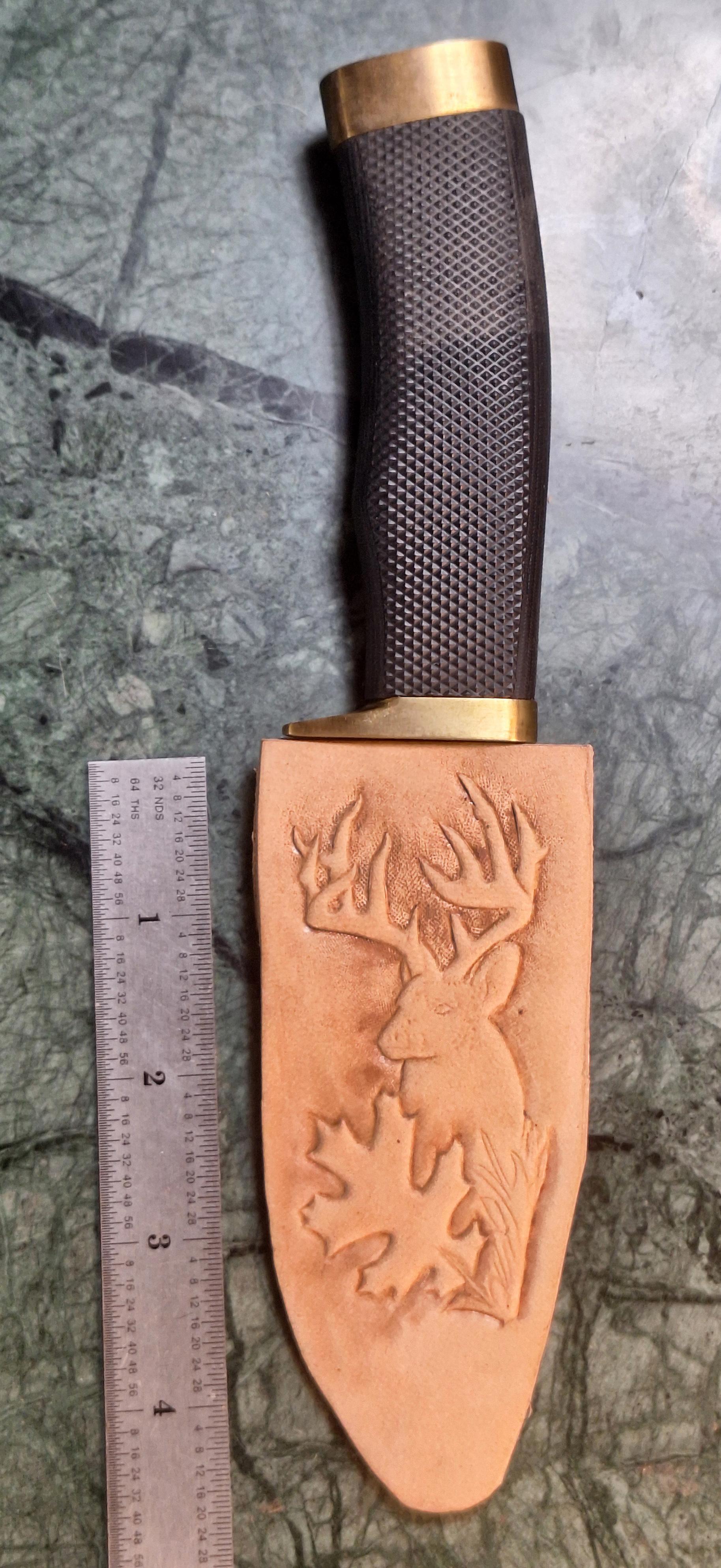 Working on a sheath for a Buck 692. It is smaller than it looked when making the pattern. Haven't been able to do fine work fora while due to getting a piece of metal smack dab in the middle of the pupil. Got it takan out and the Dr. said their may be permanent damage, due to digging it out. My left eye had been like looking out the bottom of an old glass coke bottle for over the last week. Last 2 days it has been improving, tried doing some leather last night but without depth perception my cuts were off. Today almost normal. I am so happy, and pray my eye will finish healing.