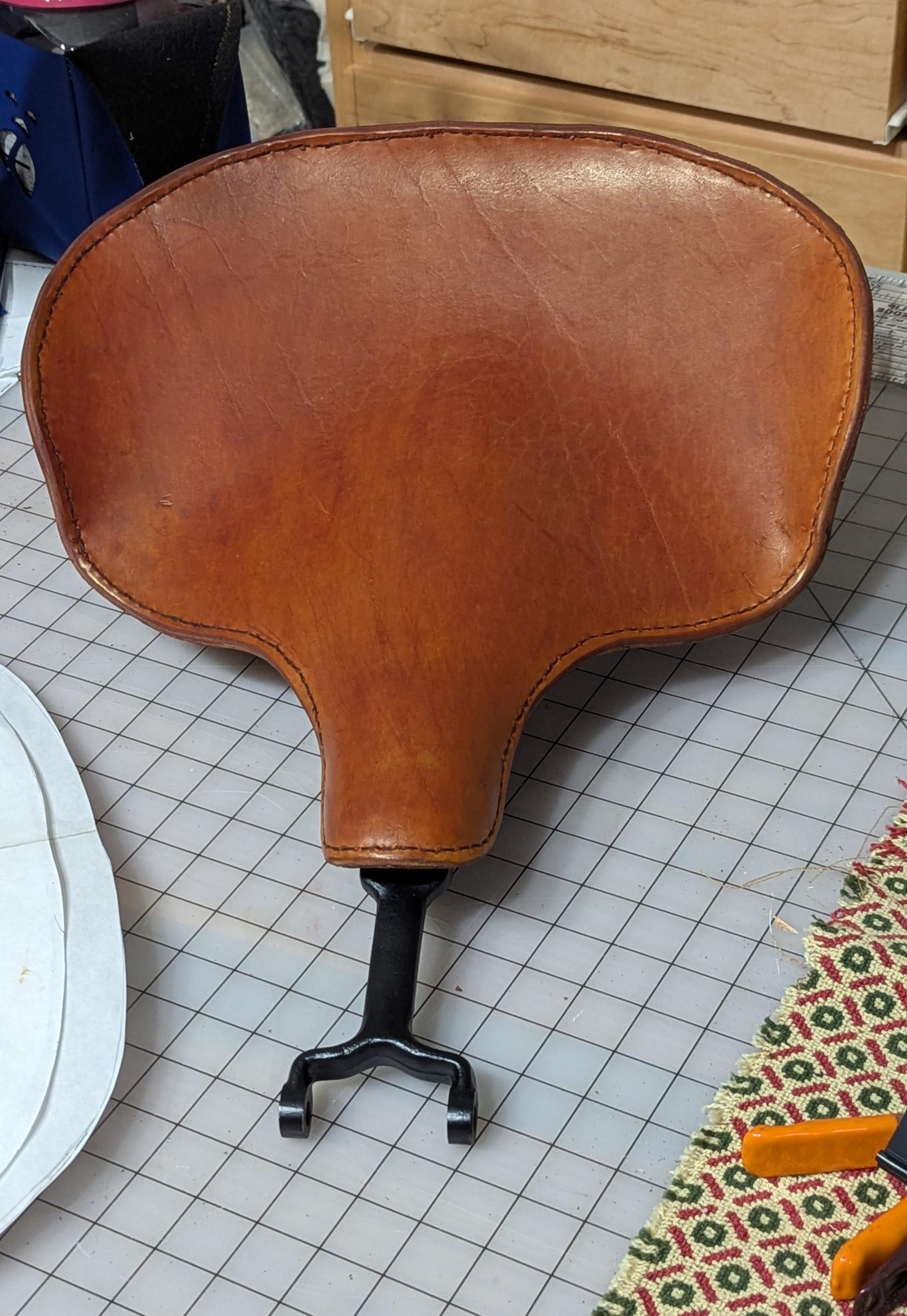Here it is done, pretty much. He darkened it more and kept working the nose (more curled). These earlier (24,25?) seats only have a partial back, as seen in the picture of the frame. So the first layer of leather is kind of the bucket. This seat has boiled (felted) wool (from an old blanket) and a heavy linen weave to protect the wool. (?) The top leather layer is cut a little bigger to get the sling and fit right before the stitching, final trim, and burnishing. I would have done the wet and weight trick with a carefully drawn stitchline, then would have definitely sculpted my edge better. But my guys don't like "hold-ups". lol (or listening to granny) The motor is a 3D print, but since then, he has bought an original motor to rebuild. He didn't grow up with guys doing this kind of stuff (mostly the women are the mechanics around here). But from the time he was a little kid, he loved to make "props". He carved wood stalks and used metal pipe and probably sewing machine parts to make a pretend rifle. Once, he made a rifle so real that we quickly bought it off of him before he headed back to town, where he lived. So, for the seasoned, this might not be up to par, but by the time he is done, he will know every detail, and it will be amazing.