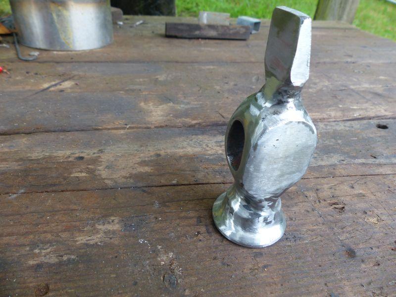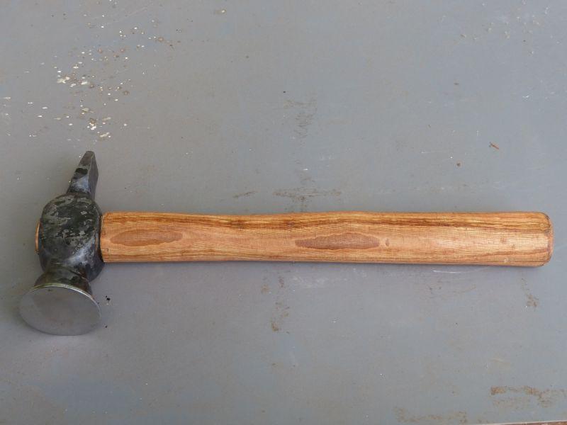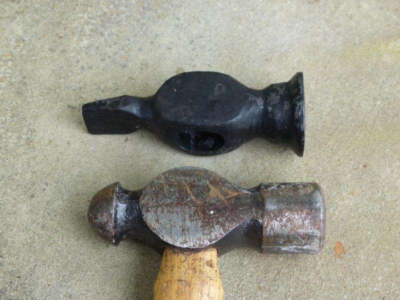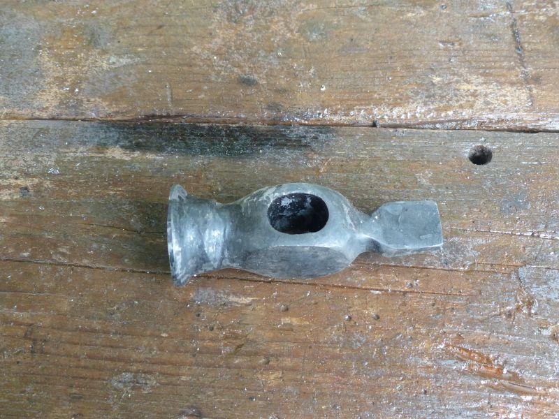 2. I've long wanted a cobbler's hammer (mainly 'cos I don't have one!). I remember my dad had one but it disappeared a very long time ago and wasn't among his tools when I got them. Very difficult to find, particularly used, so I thought "why don't I make one?". Can't be that hard. Hah, should have known better! I found a ball-peen hammer head for $3 and away I went. First thing was to reduce what I think was a very large tent peg to fit the hole in the head to prevent it from collapsing during the forging. I don't know what steel it was made from but it was tough to move under the hammer! Then it was time to start widening the head and likewise I don't know what the steel is in old hammers but this stuff is also hard to move. Once it got below orange heat the hammer had no effect on it. Eventually I got it to a suitable width and then mashed out the ball part to a flat. This hammering, by the way, didn't do my tennis elbow much good!!! I cleaned it up on the belt grinder and then heated it to non-magnetic and quenched in oil. I thought I'd have to temper it but a file could still (just) mark it so I called it good. I suspect the mass of the head was too much to cool quickly enough in oil and suspect quenching in water would have been better but it should be hard enough for leatherwork. I decided to leave the oil-quench coating on to give it some rust protection and just polished the face. The handle is from some Blackwood that I cut down years ago and saved just-in-case, need to give it another coat of linseed oil tomorrow. Was it worth it? Dunno, but it's something I just had to do.