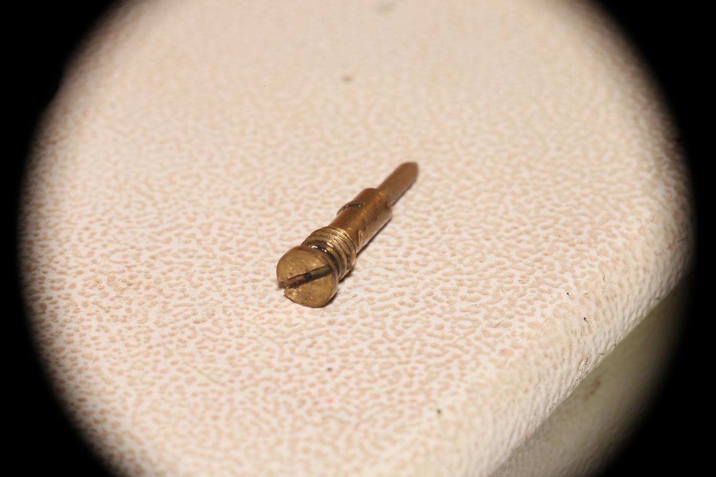 Removed the hook This brass screw was screwed into the end of the hook shaft. The near end has a tiny hole in it, like a carburetor jet. The far end is not brass...rather looks more like fiberglass. Perhaps it is porous? After washing the brass screw in soap and water, I tried blowing through it. Nothing seemed to come out. -