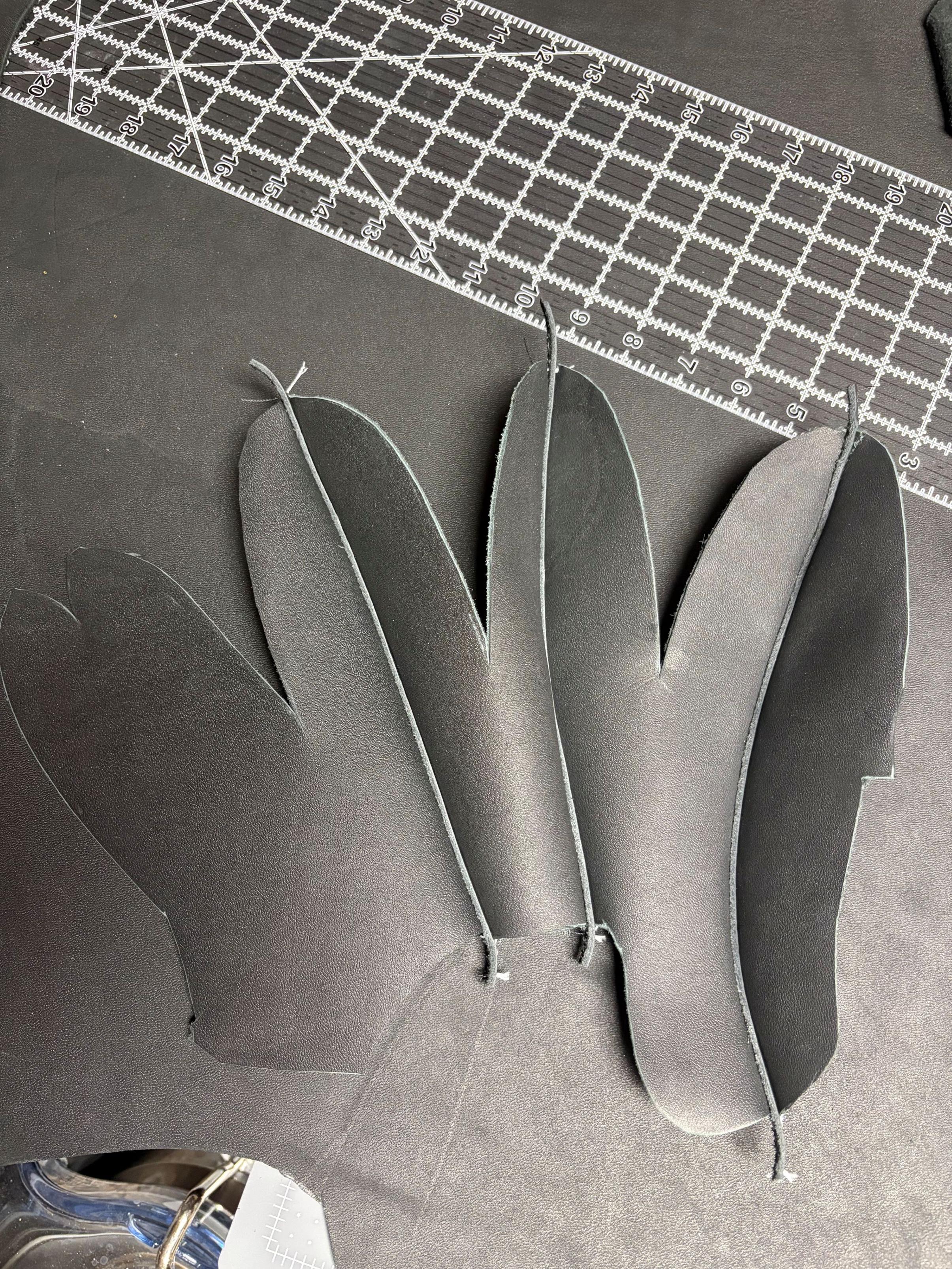 3. So, after several attempts (and wrestling) I think I have made some decent progress. I think the addition of a bell skiver made a world of difference. The one photo is of the finger backs I sewed. You can see a decent curve on the pinky side. Now I am fighting the thumb pieces, in other photo. That has a much larger curve. Making progress though.