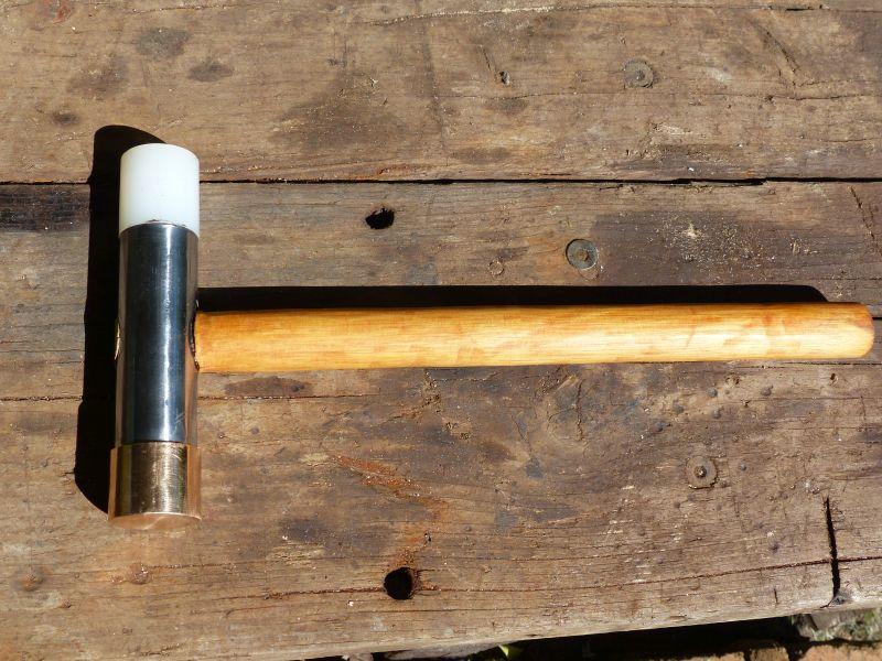 I made this primarily to use with my lathe but it may be useful for working on sewing machines etc. Copper face one end, nylon the other, copper was melted from motor windings. I found that copper is a pain to turn in the lathe as it galls and creates a rough finish!