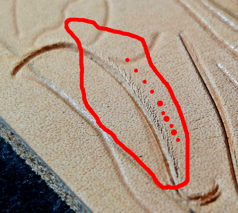 I'm embarassed to ask this when I have experiented with tooling this long already. Seems fundamental or elementary. I put red dots near what I mean. The slightly raised ridge lines with tiny stretch marks pulled along with them. It's good leather; HO. I did have to stick it in the fridge overnight after tracing lines, to work more later on when I had more time, but that's going to happen a lot in my life. If I'm moistening it too much, esp. to bag and refridgerate, I'll have to get a handle on it. t's more moist than the color looks here; a whack on a shader burnishes nicely. If it's because my blade isn't sharp enough... I don't know what to do. I have worked at that art of sparpening until it will shave some skin off my thumb. Surely that's at least as sharp as some guys who do great and claim personal sharpening deficienies. It is stroped to mirror smooth and all. I didn't start or end those visible lines very gracefully but, neverminding that -- ...could I be cutting just too deeply? It's 9 or 10 oz. and it just didn't feel like I was cutting through too deeply relative to the leather's thickness. But I guess going deep enough may force the line so wide, with a standard blade, that it eventually reaches the end of the bevel on the blade, even. Maybe that could cause pulling as well. I'm a little lost on something here that's obviously such a beginner thing I should never have gone this long without asking. Sometimes I luck up and only have this happen on one side of lines that I'm going to bevel enough to cover it up. Back beveling doesn't help as much, lol. Thanks for your thoughts. Too moist and too deep?