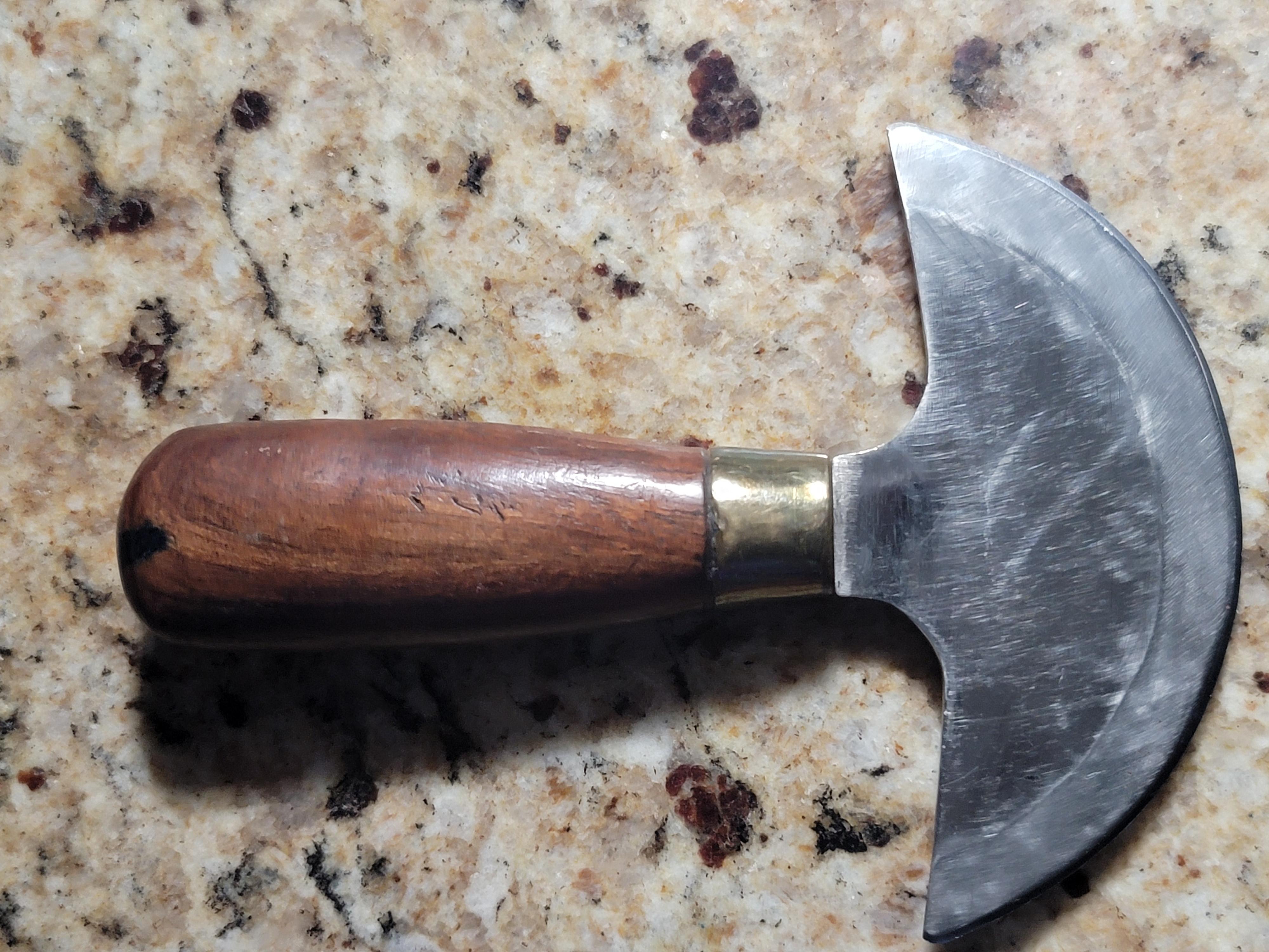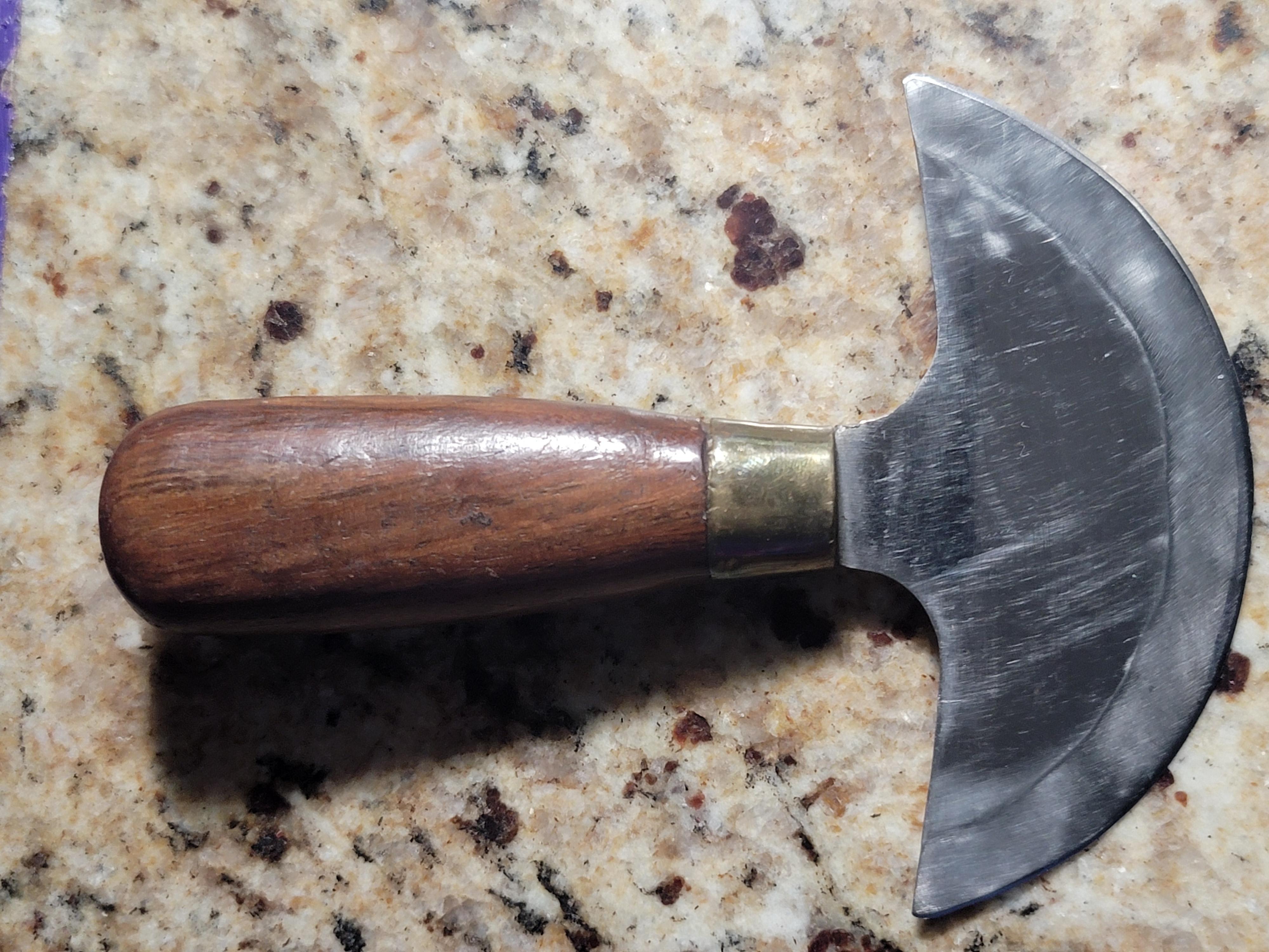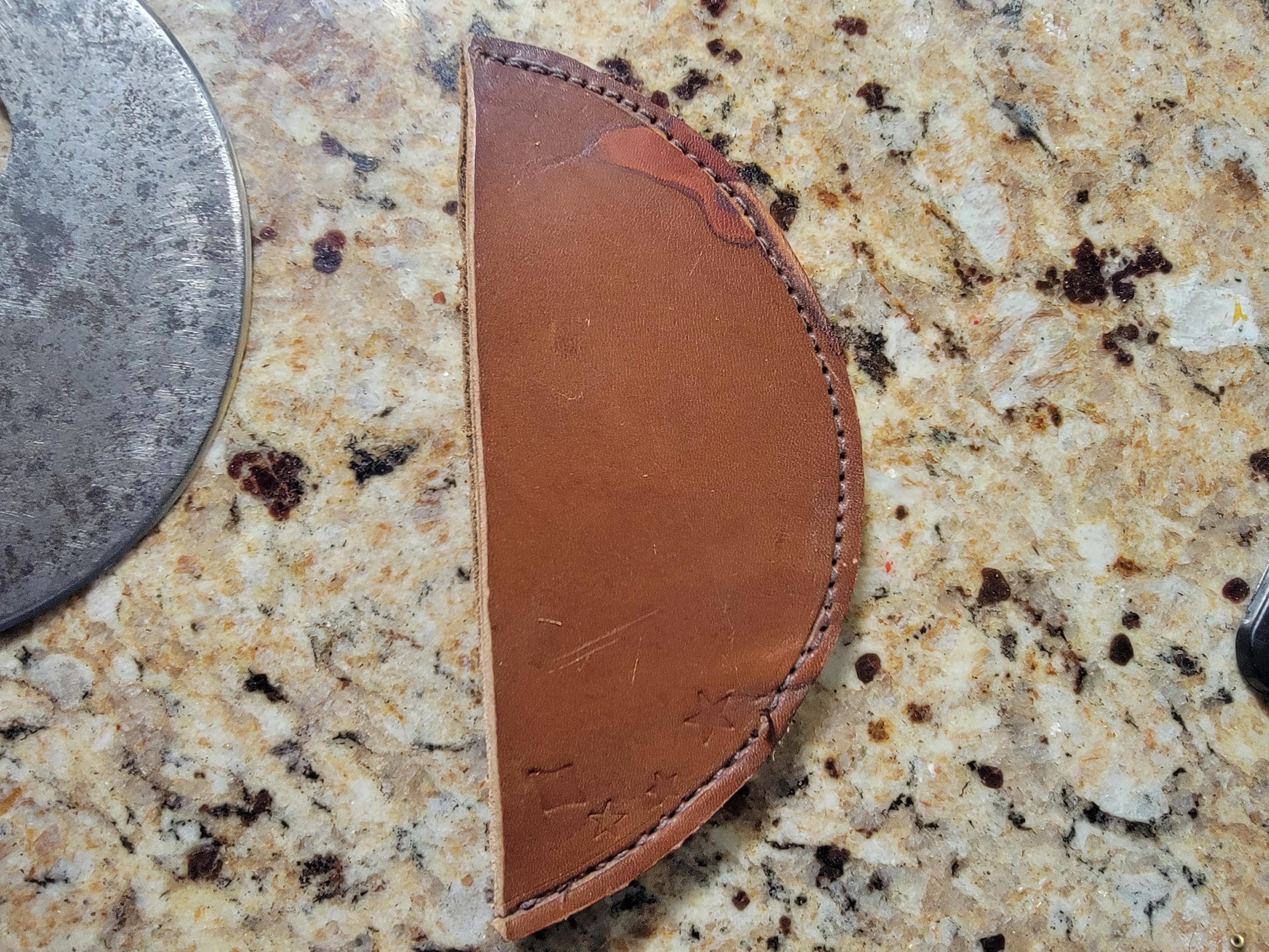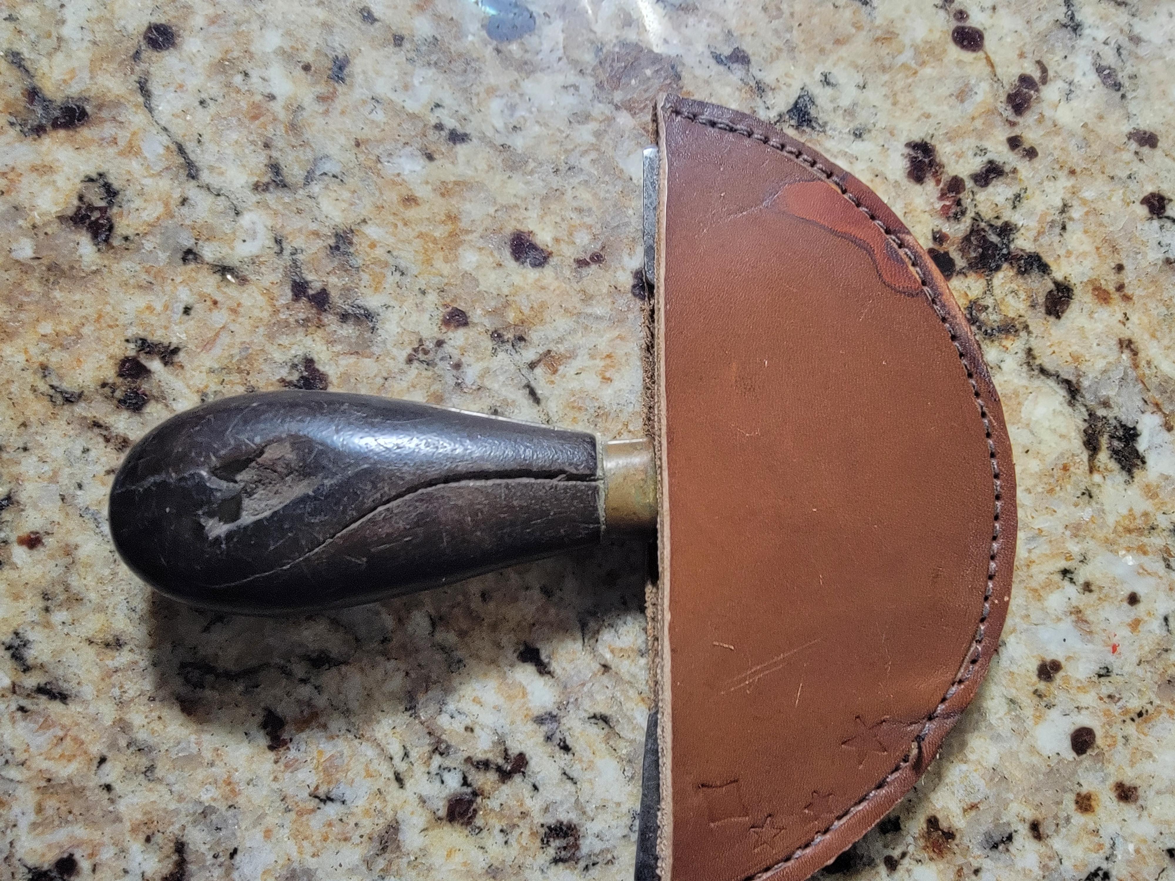 This is a home made knife, slightly larger that the Tandy round knife. This blade actually cuts as well or better than my commercially made knives. Ther4 handle can be replaced by pretty easily. I just never had the need. Comes with the slide on cover shown. $40 plus shipping.
