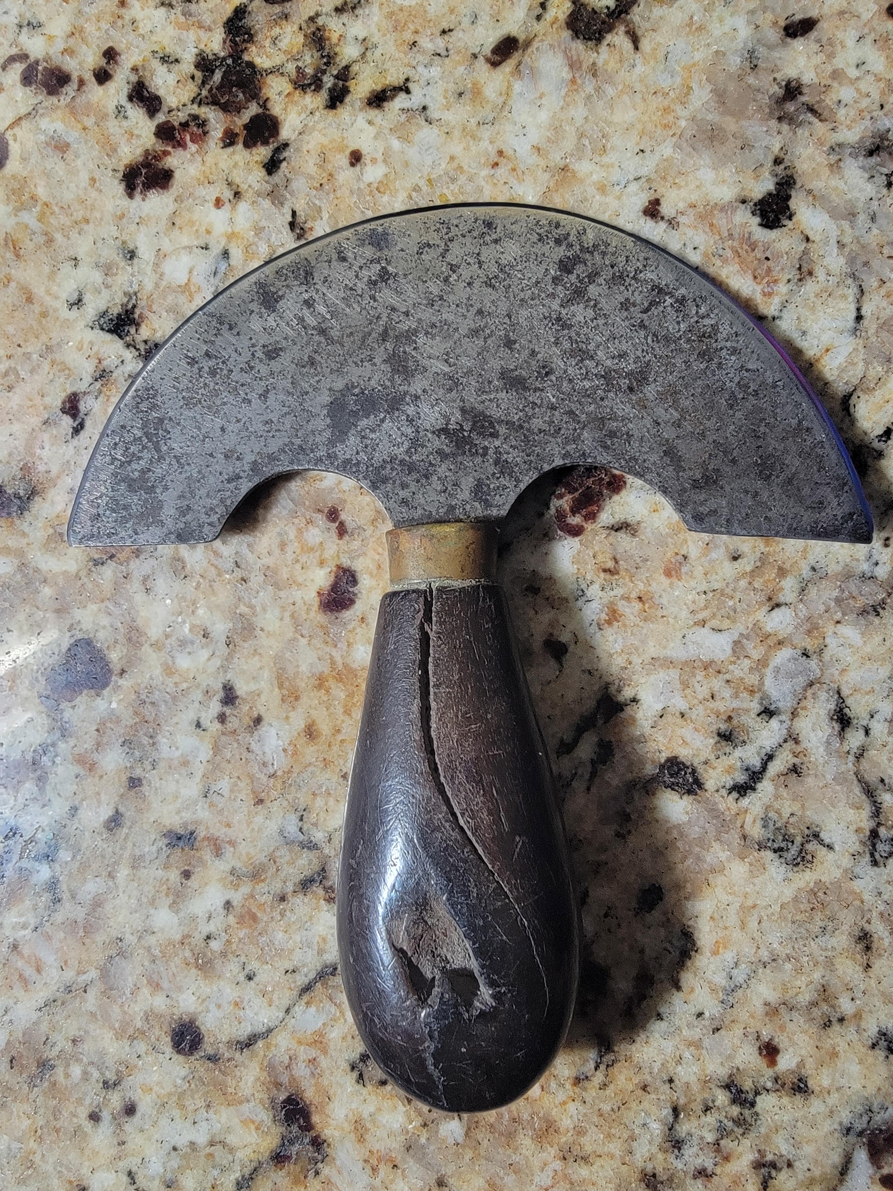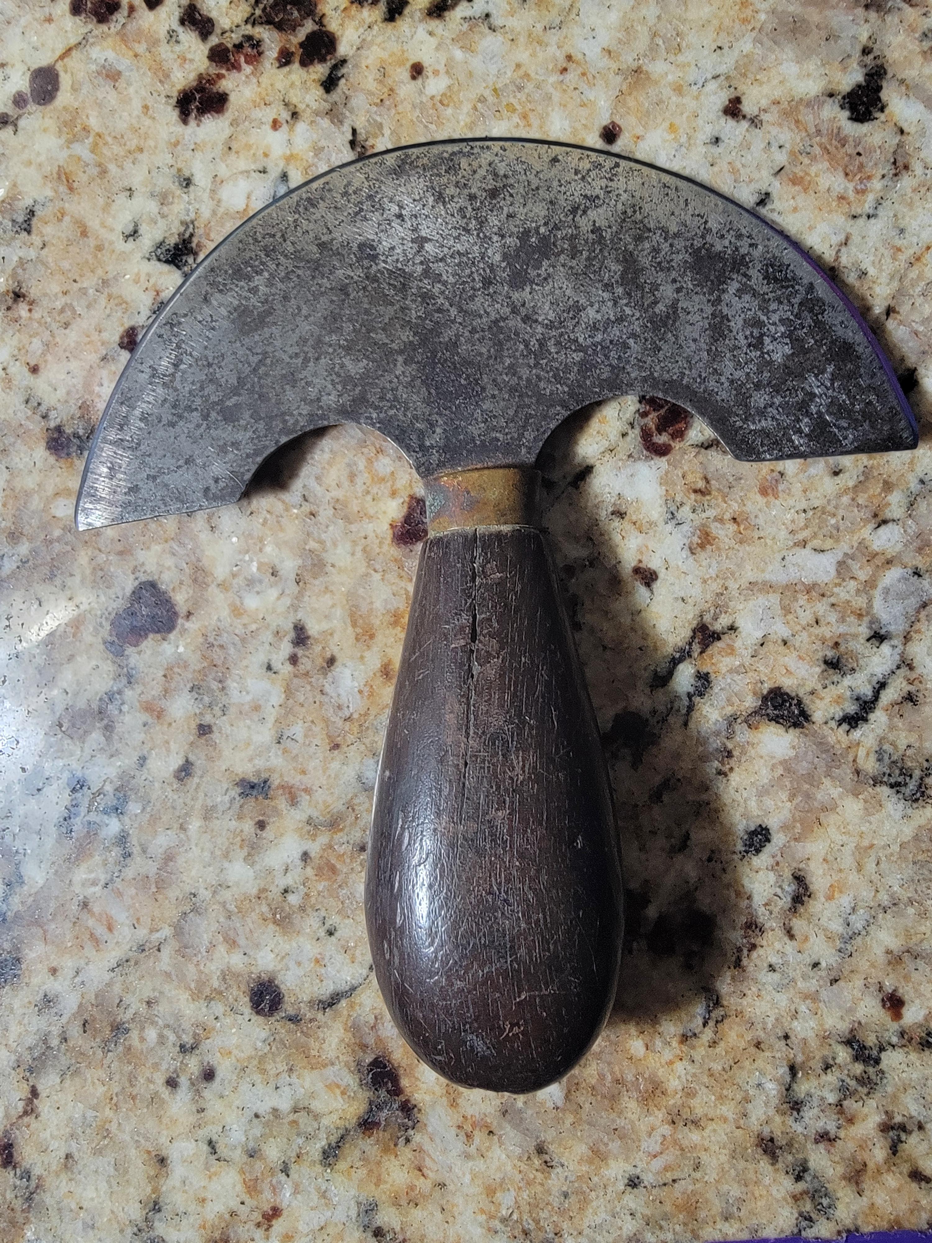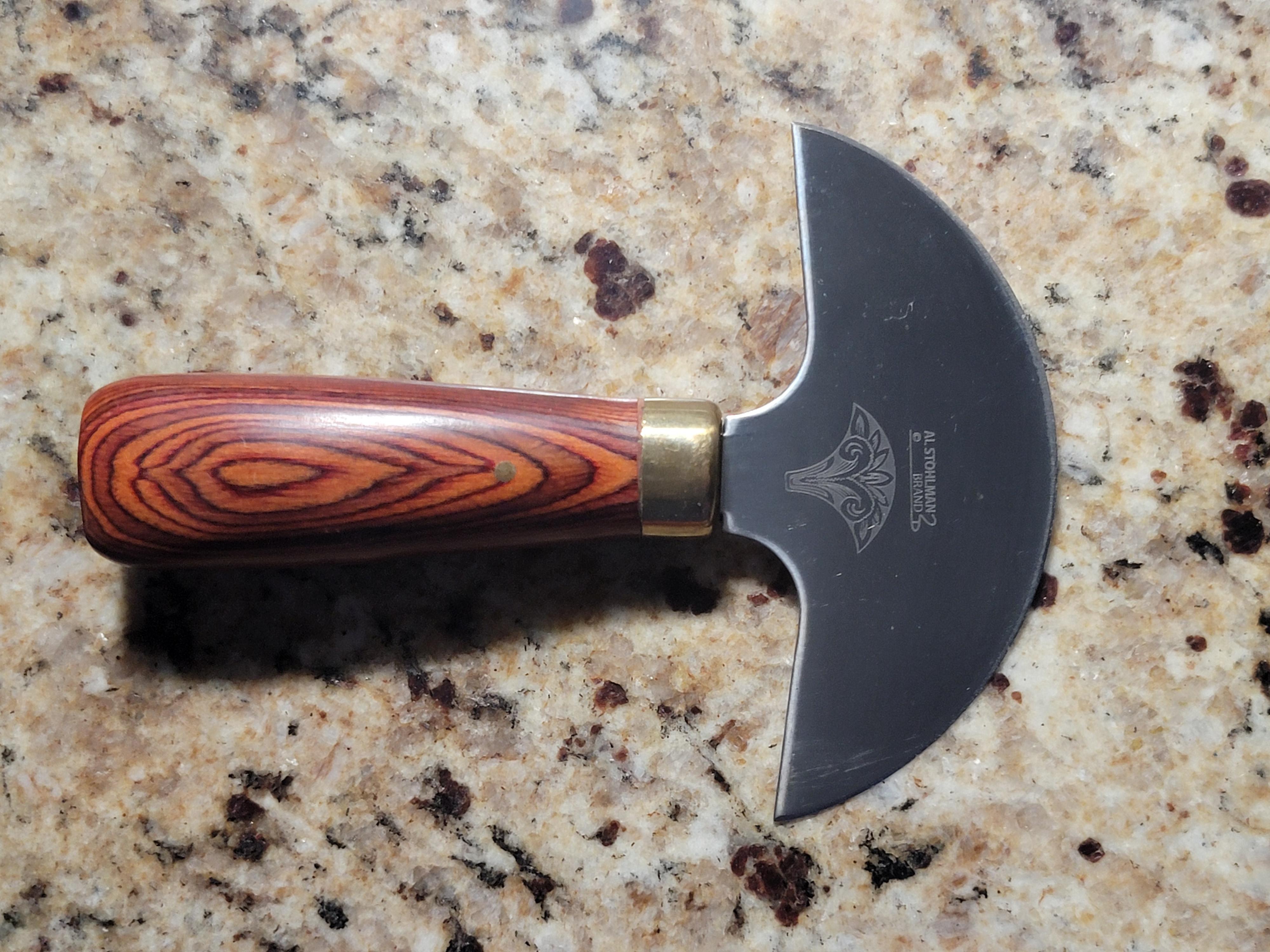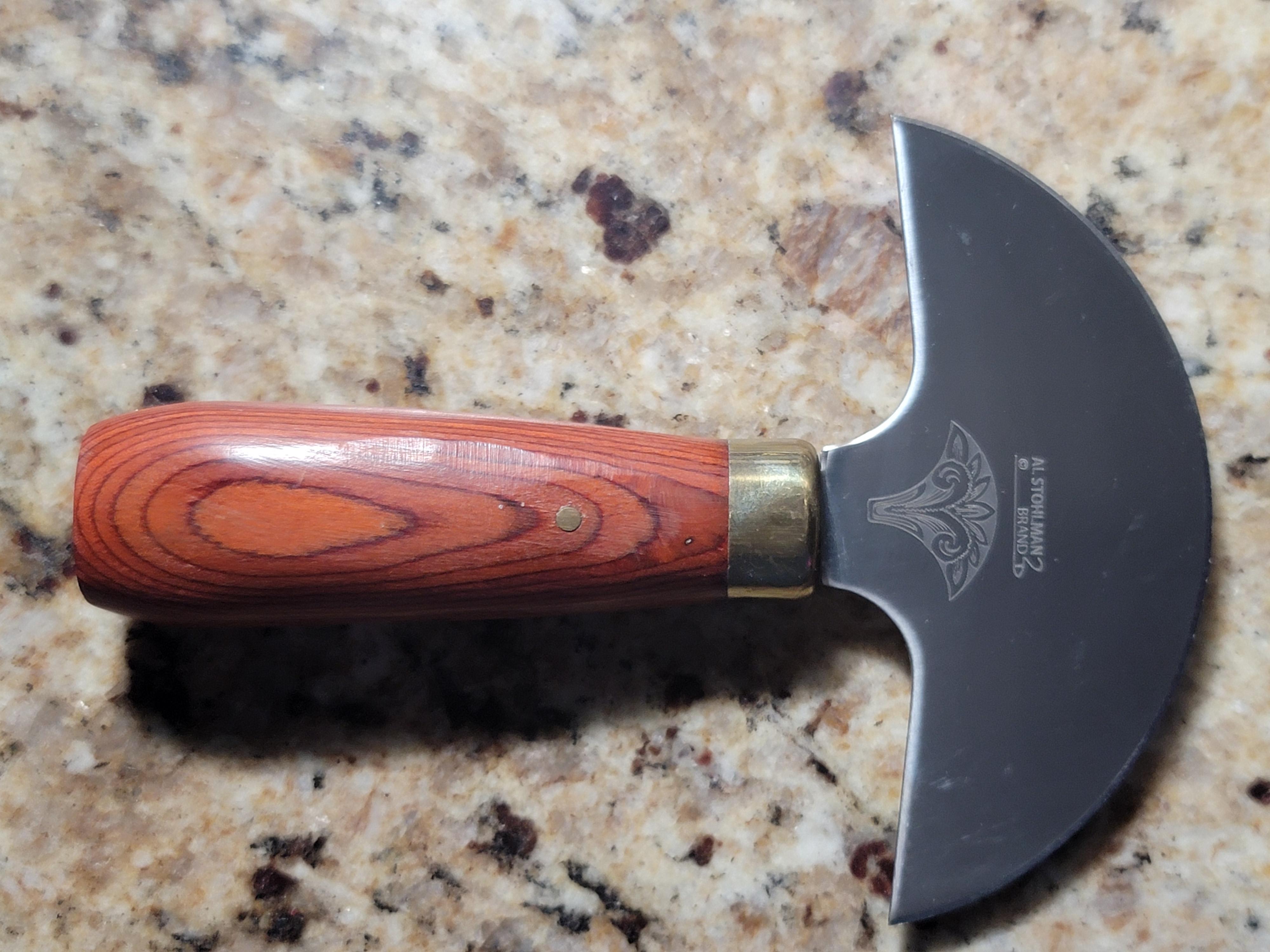 This is a home made knife, slightly larger that the Tandy round knife. This blade actually cuts as well or better than my commercially made knives. Ther4 handle can be replaced by pretty easily. I just never had the need. Comes with the slide on cover shown. $40 plus shipping.
