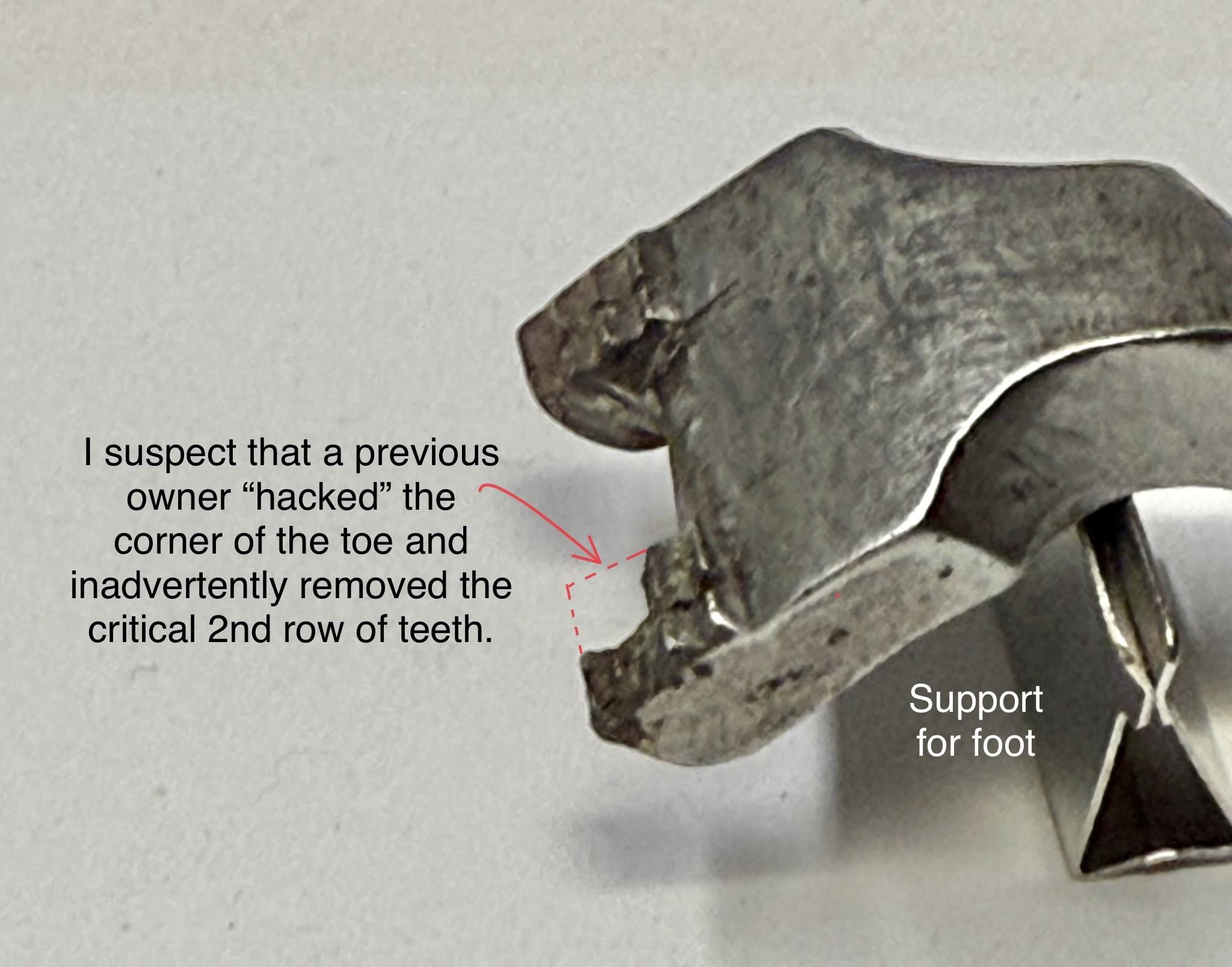 Hi leatherworkers, I have a Vilh Pedersen 308 sole stitcher. Unfortunately it is near impossible to stitch in a straight line and I suspect it may be because a previous owner seems to have “modified” the foot, possibly to get a bit more space for the needle to go into the leather without hitting the foot. Subsequently the 2nd row of teeth are missing from one side as well a about 1.5mm in width of the toe part. So I have two questions: [1] Am I correct in believing that the toes on the presser foot, that is the section with the ridges that move the leather forward are supposed to be equal in size, shape therefore perfectly symmetrical and able to move the stitches in a straight line? [2] Is there any way to rectify this problem of poor stitching as I doubt anybody has a spare presser foot to sell or is it possible to have one made, perhaps 3D printed? Thanks for all and any information so that I can get this wonderful old machine working as it should. Regards Cheryl in Perth Western Australia