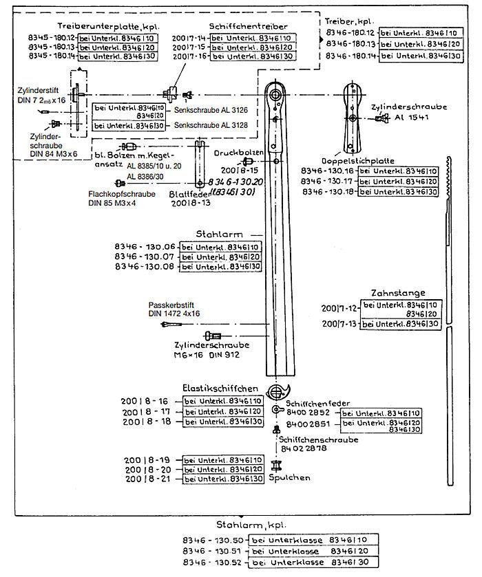 Yes, its a 8346-20 medium hook machine. Top threading seems to be okay but indeed, the "wedges" don´t belong to the machine (check the parts list - see picture below) and are probably part of the problem. I assume when the top tread goes around the hook the thread keeps handing on the wedges - somehow (maybe not but they don´t belong there anyway). Hard to tell what the guy 5 years ago did with the machine. I only can guess what he tried to achieve with the wedges. 1.) Either he tried to "rise" the hook a bit to eliminate a timing issue (Needle bar to high so he tried to bring the hook higher 🤨 or 2.) he tried to compensate wear but I doubt the machine can we worn that much already. So I assume its 1.) What I would do is removing the wedges and lower the needle bar a little bit. Some years ago I translated a 8346 mechanics manual from German to English for one of our members. I´ll check if I can find it and send you the file. It includes all values for timing and how to replace worn shuttle drivers and set the needle bar correctly and so forth. Thats the best I can do from the distance.