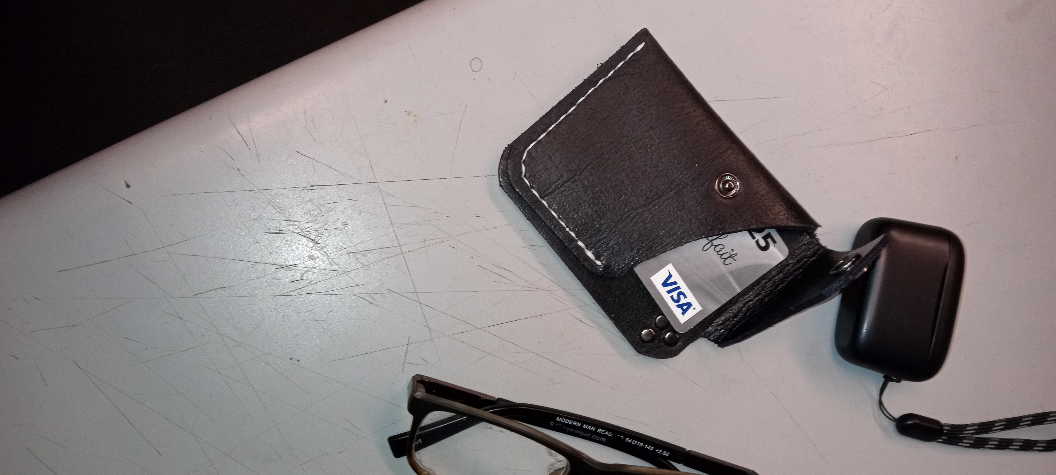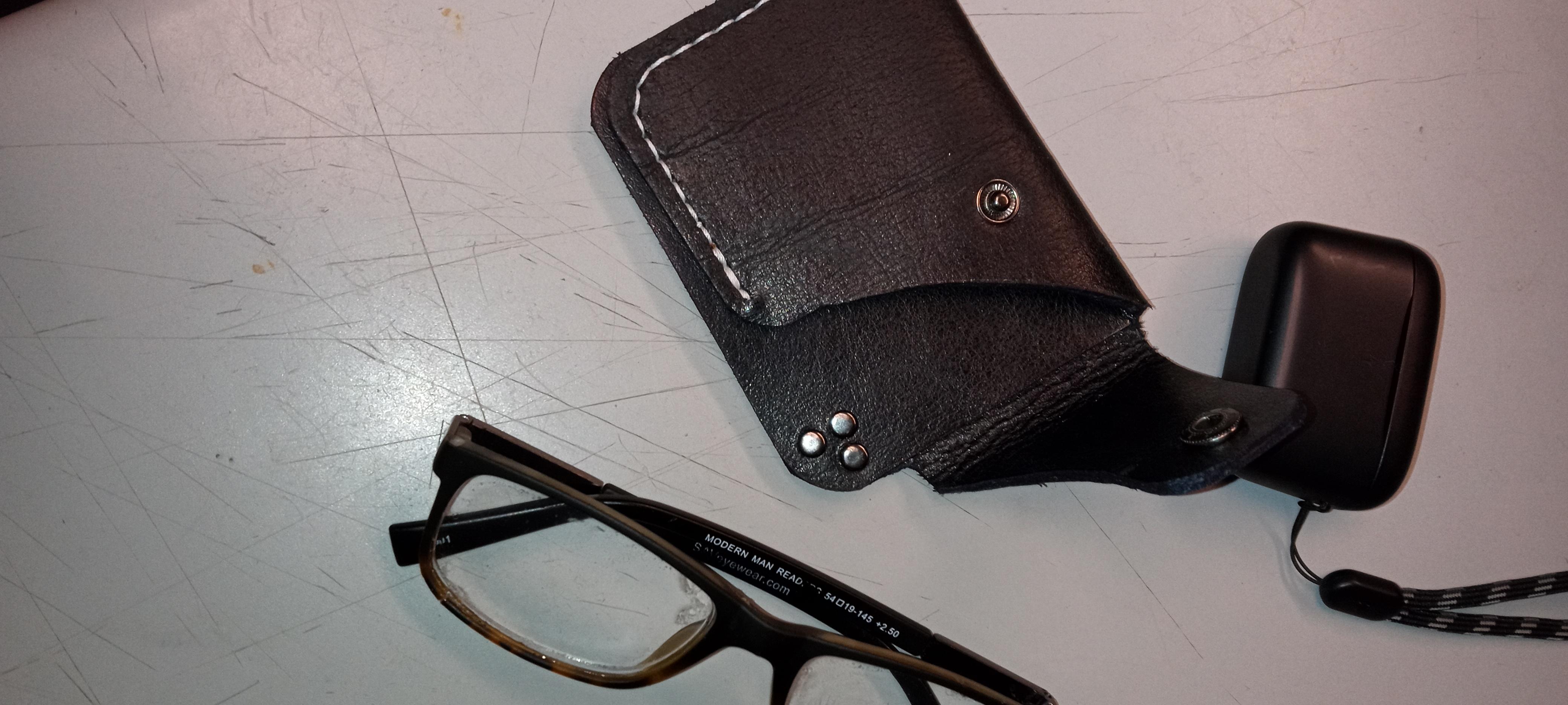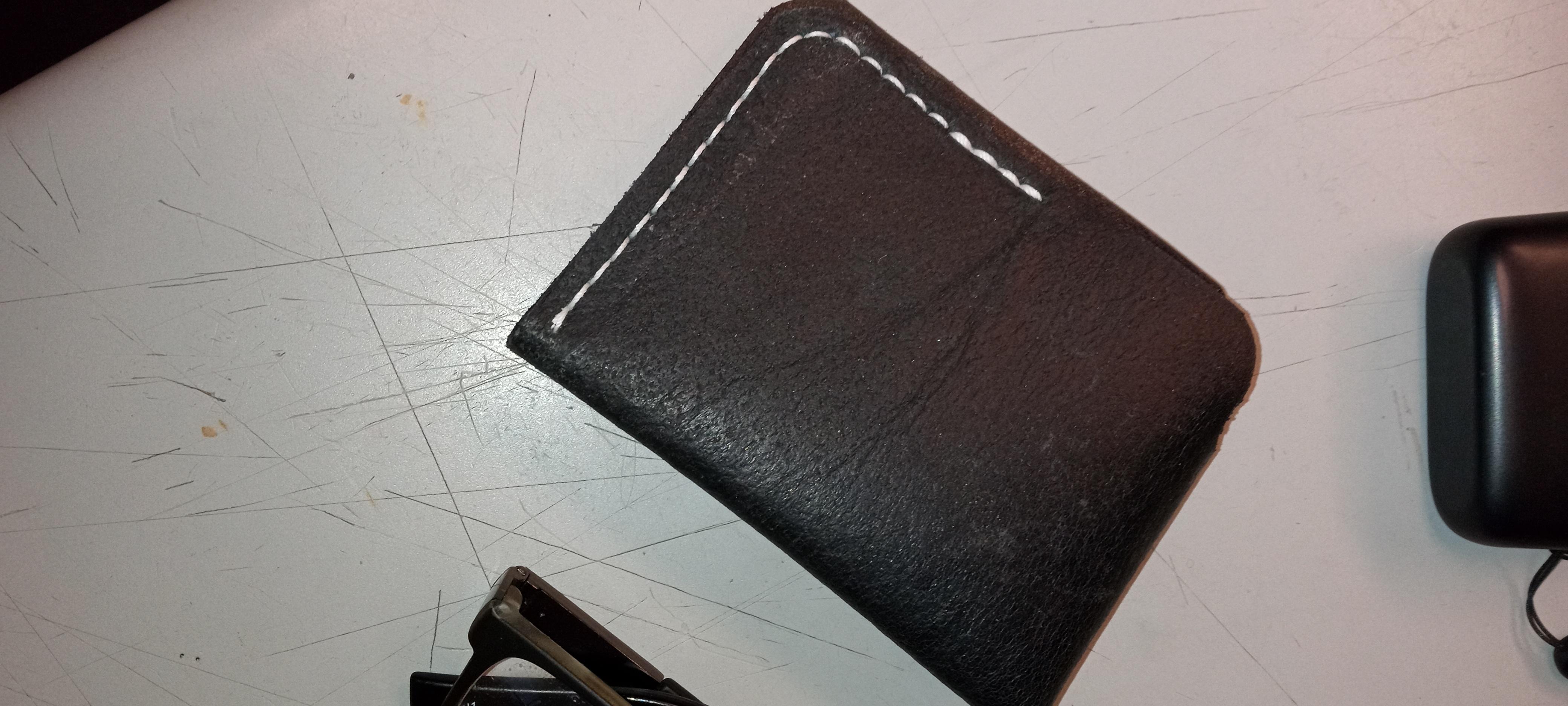 Just wanted to show off a card holder that I made, and of course, ask for any feedback. This is a two-pocket card wallet that began life as someones couch. As this is chrome-tanned leather i am not able to get a classical finish on the edges, but some black dye makes it look nice all the same.