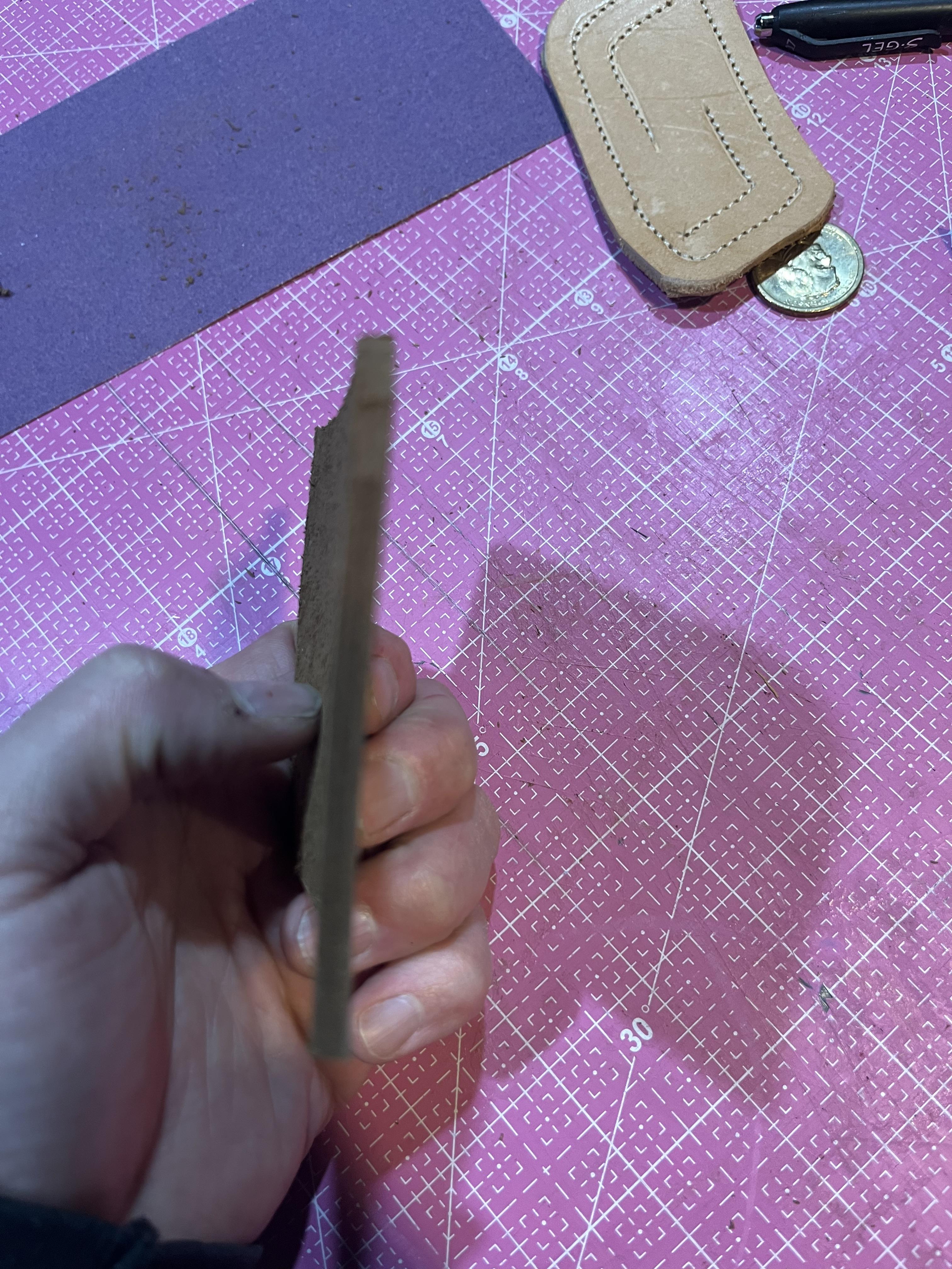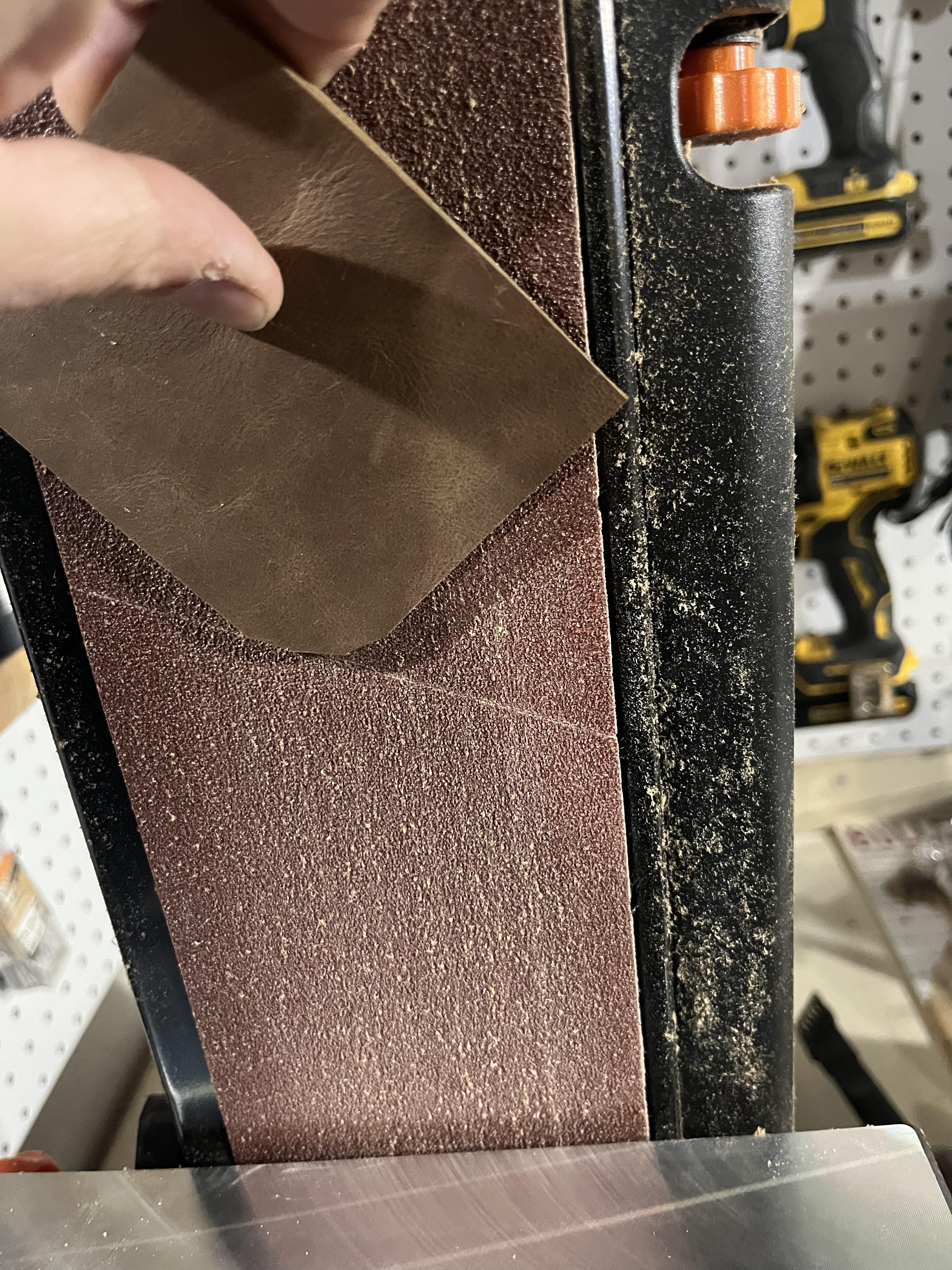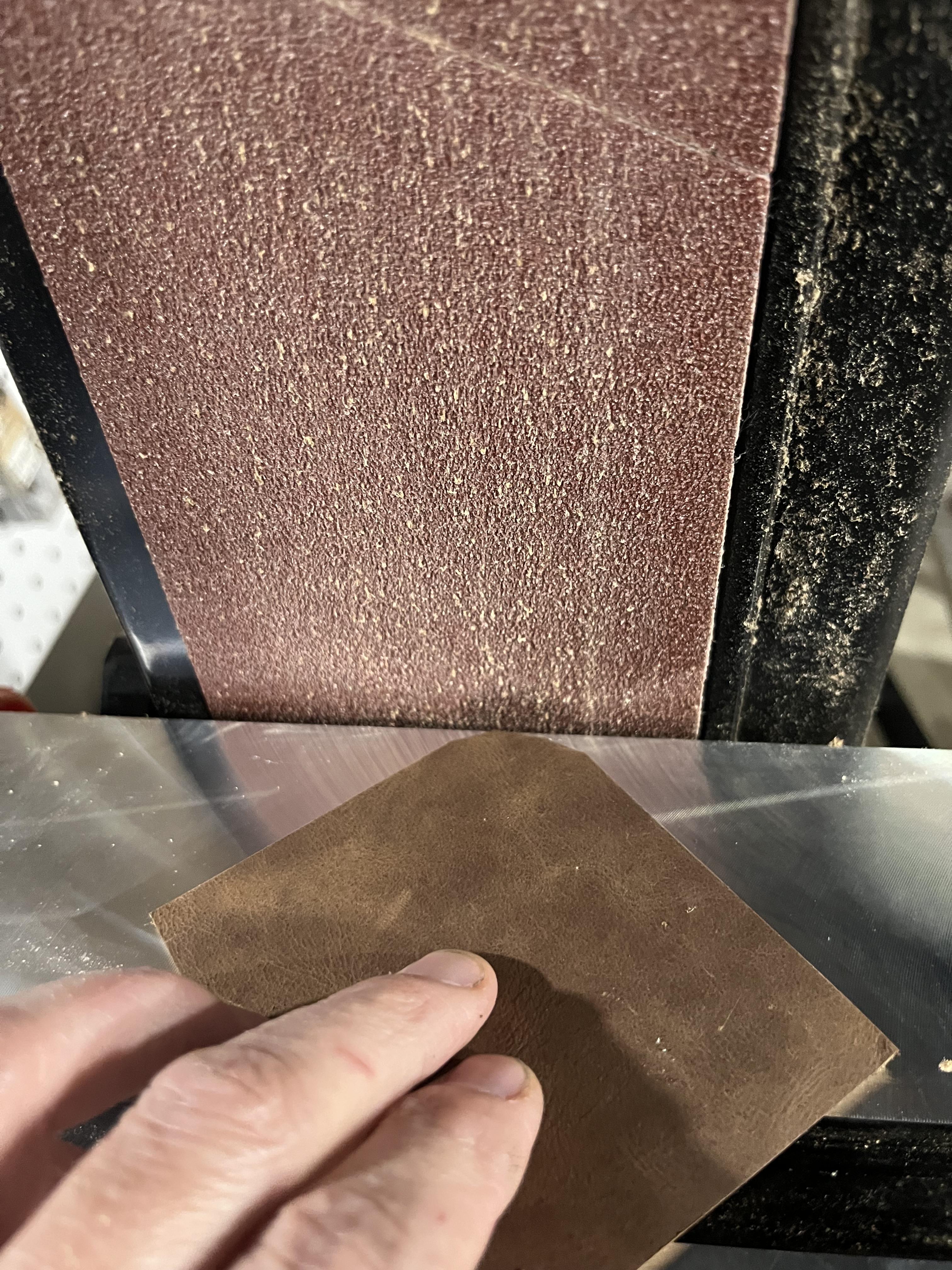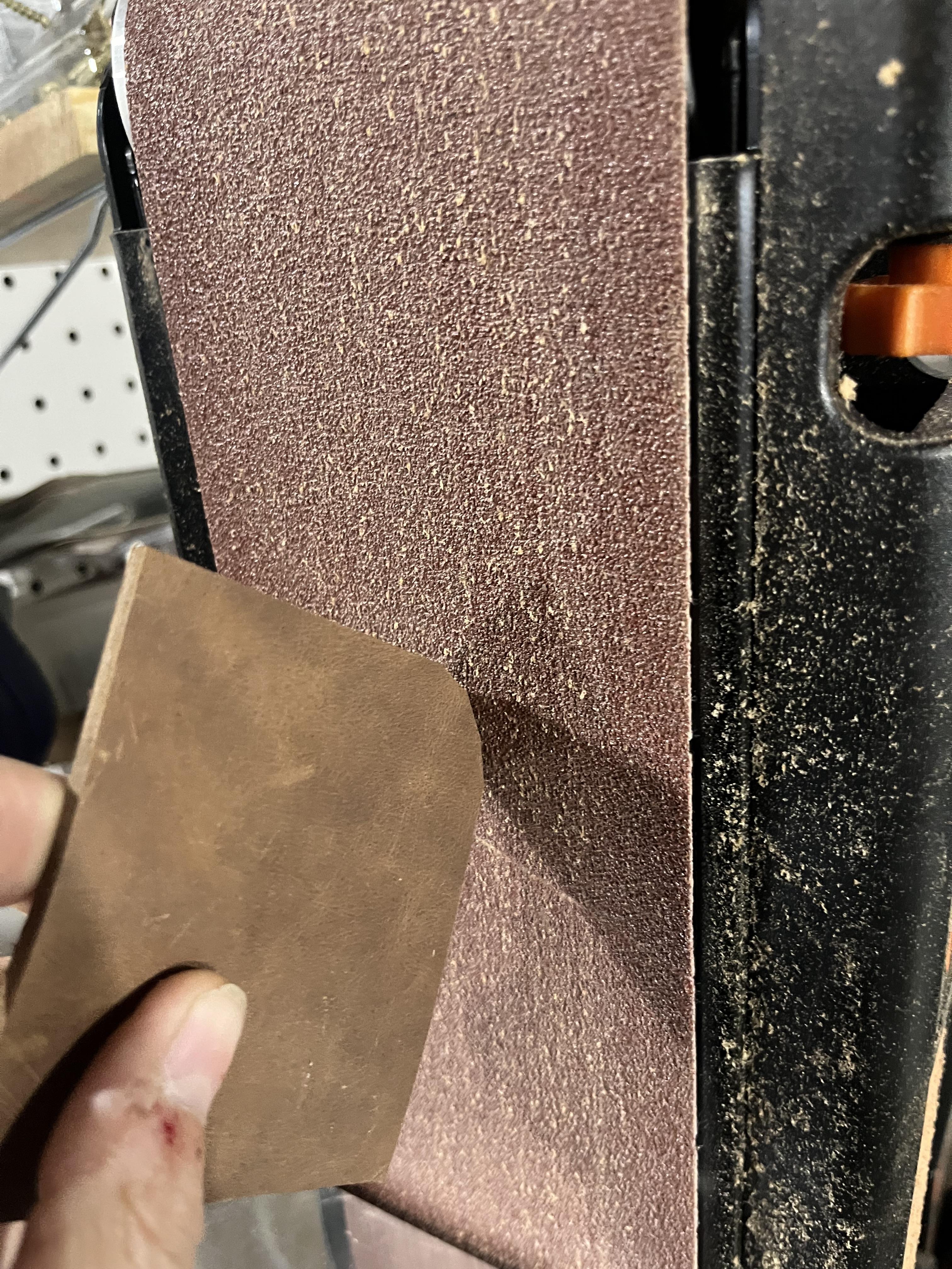 20. You need to do 3 things: 1: get 120 or 150 grit sandpaper . . . and you may even want to to up to 180 or 200. It looks like you have 80 or 60 grit on there now . . . and it is way too coarse. You also might want to hook up a vacuum to the sander . . . I did with mine . . . it grabs the dust and makes a better experience. 2: move your machine so there is almost zero distance between the sandpaper and the shelf on which the leather will sit. Mine would not move so I made a topper for the table . . . out of 3/16 basswood plywood and contact cemented it to the table. I purposely changed the sanding belt . . . and then placed the plywood shelf up so it was just barely touching the sandpaper. When I started it up . . . it sanded the plywood slightly . . . but left a VERY THIN space between the shelf and the sandpaper . . . THAT is the desired effect. 3: make sure your table is exactly 90 degrees angled from the sandpaper. I sometimes have a problem with seeing my project . . . so I outline where I want the sanding to go with a black ball point pen . . . and I sand it until the ink line just disappears . . . works perfectly. The technique is to slide the project back and forth . . . barely touching for chrome tanned . . . you can apply a bit more pressure with veg tan . . . especially if it is layered thicker . . . like a knife sheath or holster. When you have your desired edge . . . comes the final tricky part you need to do. Turn your project over and VERY LIGHTLY touch the sandpaper. It will take off a little "edge" that the earlier sanding produced. Try it . . . you'll like it. May God bless, Dwight