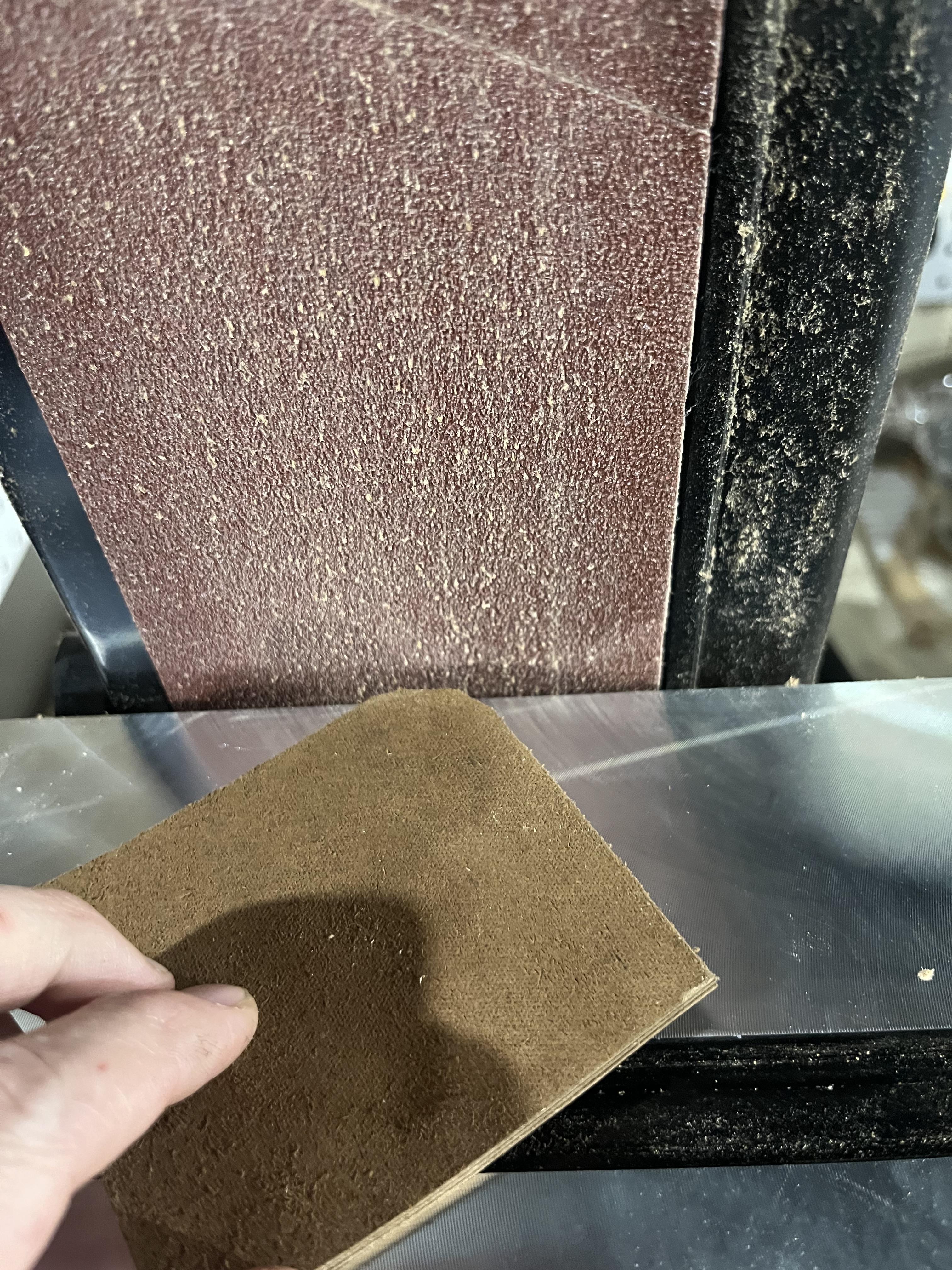 2. So this is what I was able to do with 60 grit belt. I sanded the top and flesh side slowly flat on the table. The I sanded the flesh side against the belt and finished up by sanding the edge. I’m gonna grab lower grit belts tomorrow.