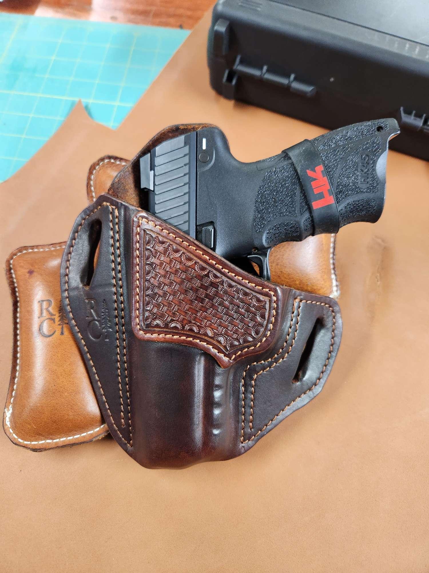 Check the holster section. Finished the inside with 100% resolene, then just a wax on the outside. 8/9 Hermann Oak Dark and light brown fiebings dye 207 bonded nylon top and bottom Cobra class 3