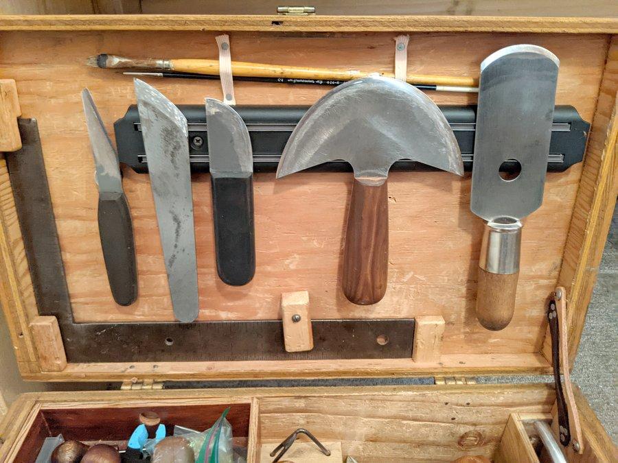 Tooling - Wayne Jueschke stamps and mauls, the mauls are ergonomic for me and the stamps are about as fine of an impression as you will find. Knives - I still go back to my Dozier knife. I have had knives from about everyone and I still will never part with the first Dozier. Bob Dozier no longer makes knives. Tooling bench - I have a granite inspection plate inlet into a bench I made. Solid support underneath. No bounce and the only noise is the soft "tink" of the maul striking the stamp. -