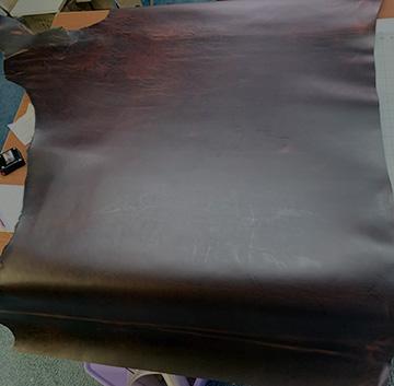 Deep cordovan color leather. I have made belts and dog harness from this leather. This skin has wrinkles on about half of it. Working dogs don't need A+ leather for their harness. I used the wrinkled portions for that purpose. Best portion measures 30" x33" while wrinkled portion measures 30" x 25" (4-5oz thickness) 2.25mm thick. $75.00 plus shipping