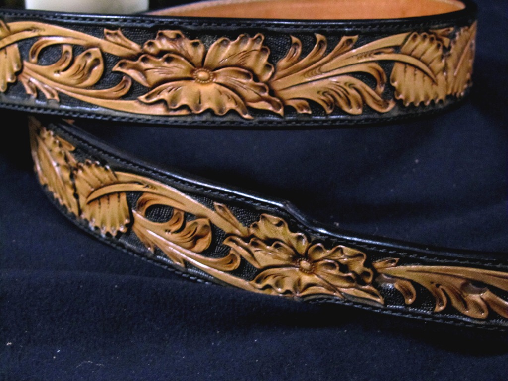 Floral Belt w/black dyed background 1 3/8 tapered to 3/4 in.