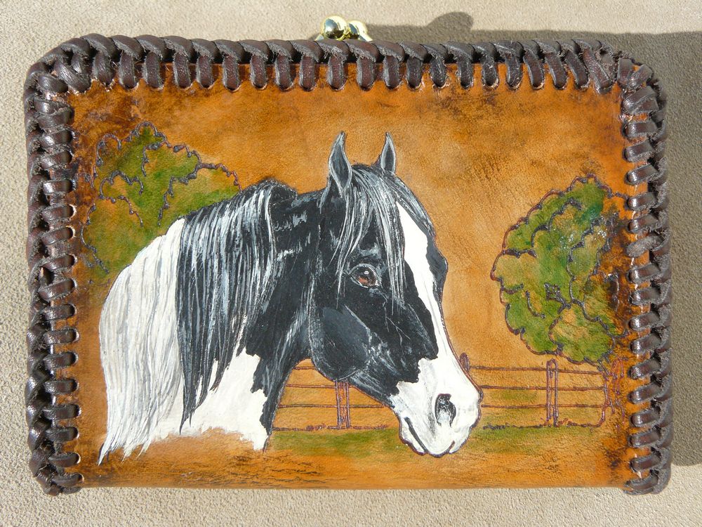 This is a little clutch coin purse that I did with a black and white paint horse on one side and a name on the other.