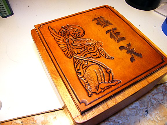 Simple piece for an old cigar box lid. Antique gel tan and java brown for the letters.