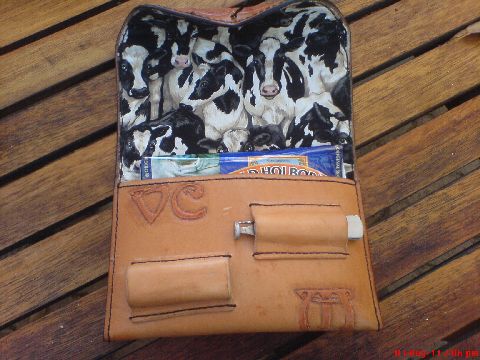 Ladykahu Posted August 3, 2011 Report This was the third thing I made. Pipe tobacco pouch for the hubby, his choice of fabric lining! I stuffed up the size of the fold over flap because I forgot to allow for the extra thickness in the tamper and lighter holders. Quote