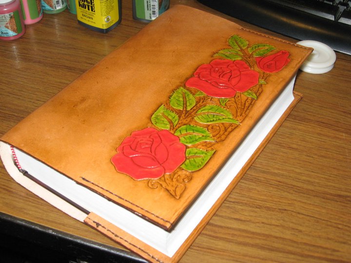 This is a Bible Cover I gave to my Mother for Christmas. It is 3-4oz Veg tan leather. I used Eco Cova colors and they worked great. Hand stitched, all one piece, no lining.