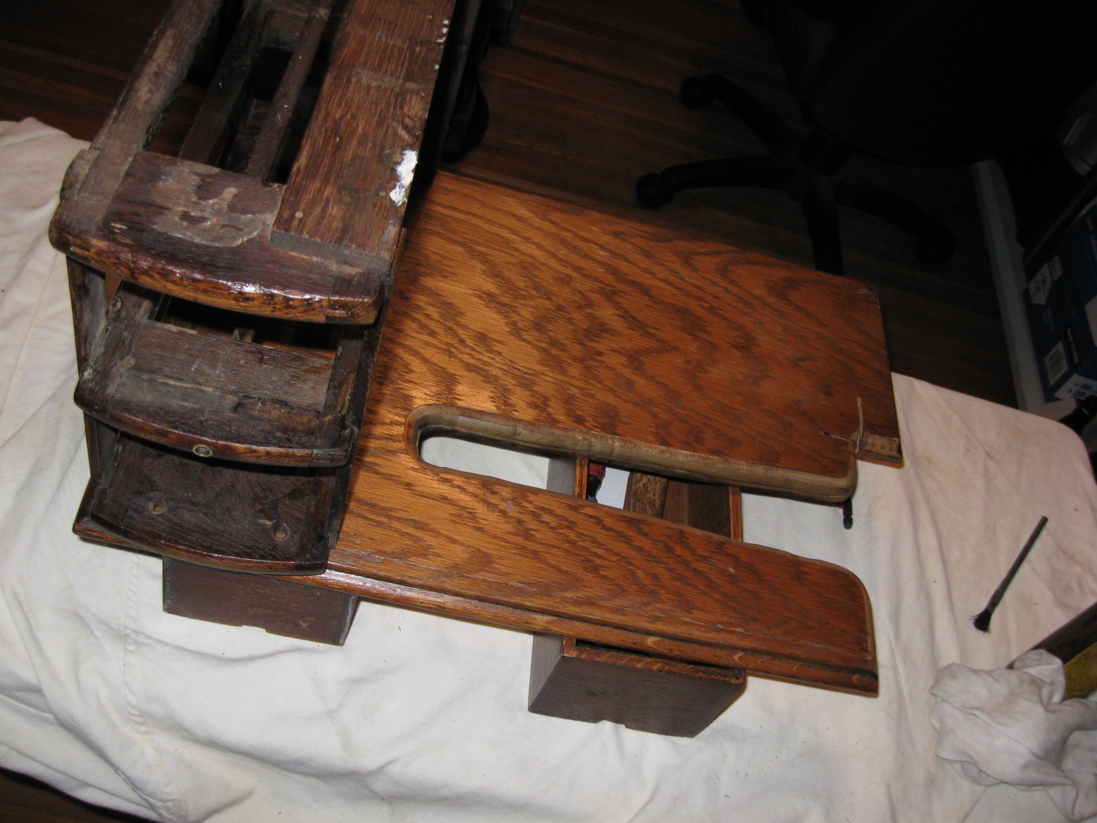 Here is an image of the initial fitting & placement of the drawer unit, it will eventually be the "support" for the end of the table and connect the working end with the iron work of the base... how to be yet determined at this point.
