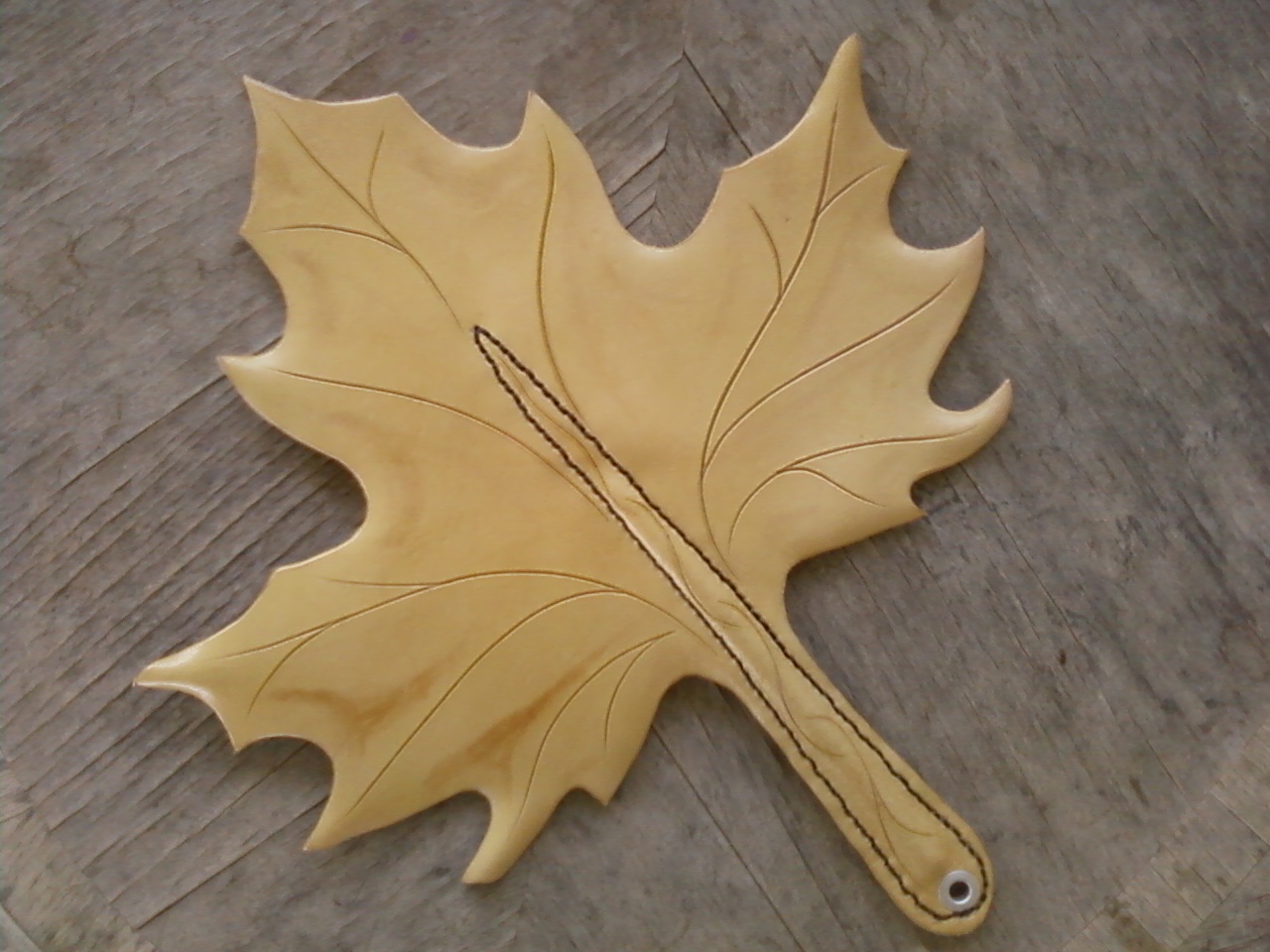 Members mrdabeetle Posted September 6, 2011 Report They vary in size from 12 x12 to 14 x 16. They put out more wind than a paper fan or an average sized Asian folding fan. They are intended for real use. This maple fan will not be dyed. Most of my maple leaf fans are/will be dyed to resemble a turning leaf like my prototype here. The wood core and the slight 'cupping' of the leather makes it pretty rigid, so it grabs a lot of air as you wave it. These pics were taken with my phone, so the colors aren't quite as good as they are when seen live. Most of the embossing on the one that isn't dyed doesn't show up well in the pic. Once my mother comes down to show me how to set up my sewing machine, the stitching will not be zigging and zagging all over the place. Quote
