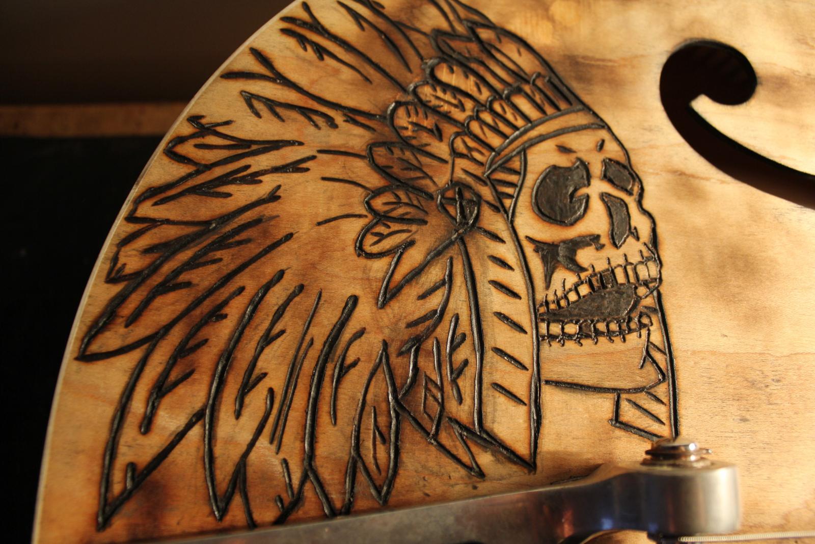 First I sanded down the top finish to bare wood than torched it played it for a while knowing something was missing I used the wood burner to get our logo on thee:) It is still a work in progress. If you notice the way the feathers are they look reversed but that is one thing i always loved about thos picture, it was not a mistake but a choice for good or bad I love it!