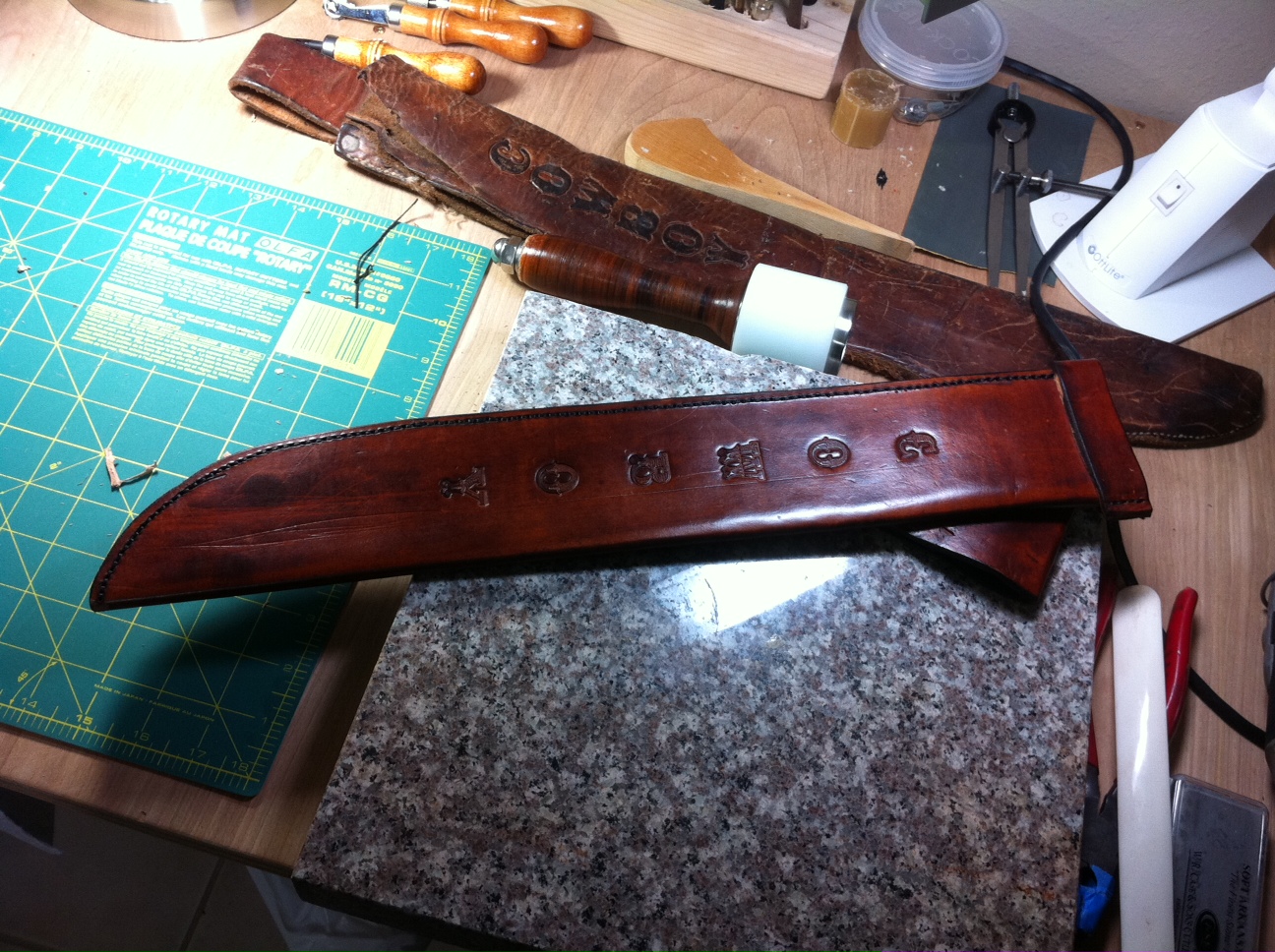 Made this machete sheath for a replacement of the sheath beside the knew sheath. One of the special items on this sheath is that it is made for the left side so the machete can be pulled from reaching across the front of the body and pulled easily. I also made it angled so it wouldnt rub on the leg when walking.