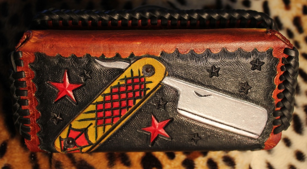 Client wanted a Iphone case that could also hold cards and cash...so I came up with this. A molded Iphone case/wallet. Triple loop stitched and some of my signature works put into this one. Arrows and Straight Razors:)