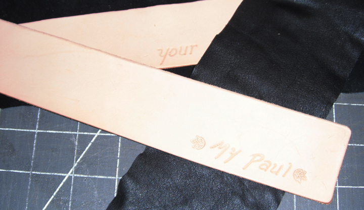 Next: Treat tooled leather with a combination of extra virgin olive oil and clove oil. Glue sueded trim with Woodweld Contact Cement. Trim excess. Apply snaps (cover?). Seal edges (beeswax?).