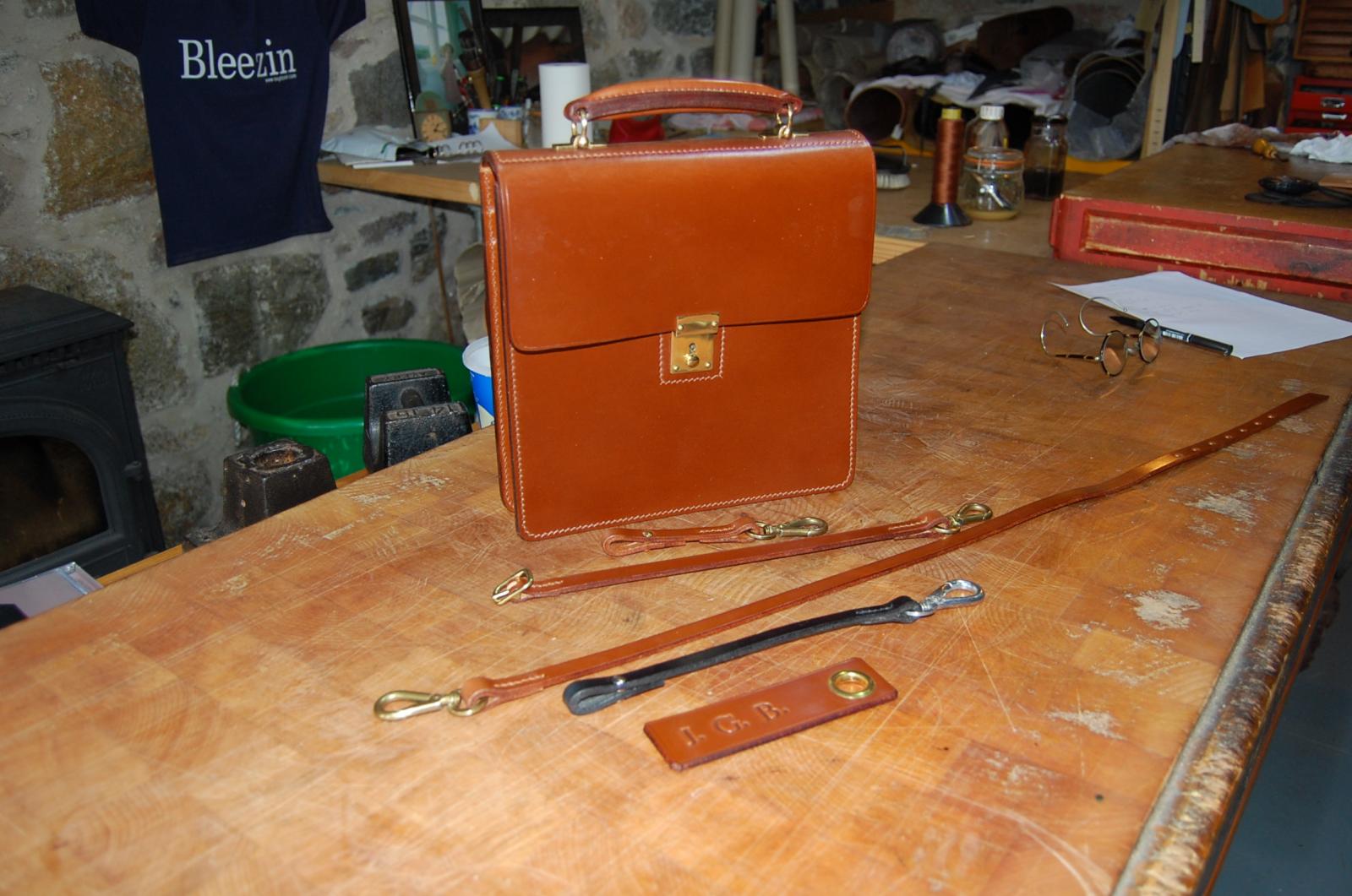 Not to be left out, this was made for the wife of a good client in Seattle. 10" wide, all hand stitched, made with Sedgwicks conker bridle butt, a joy to work with. Has pen loops and pockets inside, and came with a detatchable shoulder strap, and a wee strap that clipped onto a D ring inside, to hold a key ring safely.