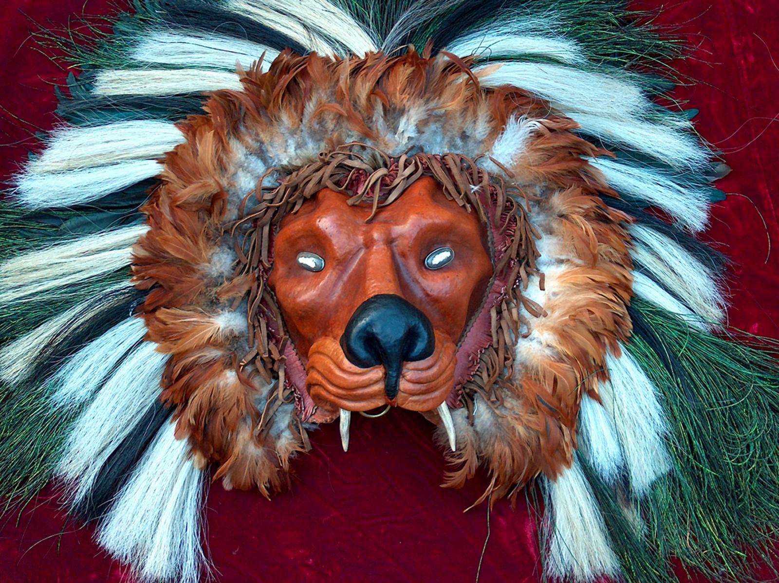 Formed mask in the style, if not the design, of the masks of the Commedia del Arte. The face is formed from a single piece of veg-tan belly around 12'x12" and raised a bit over 6" in relief. Mane is composed of leather fringe, rooster and peacock feathers, ostrich plumes and horsehair tufts. Eyes are fossilized walrus ivory cabachons set in sterling silver bezels and the fangs are deeer antler tips. Featured in Aerosmith's music video for their song "Jaded".