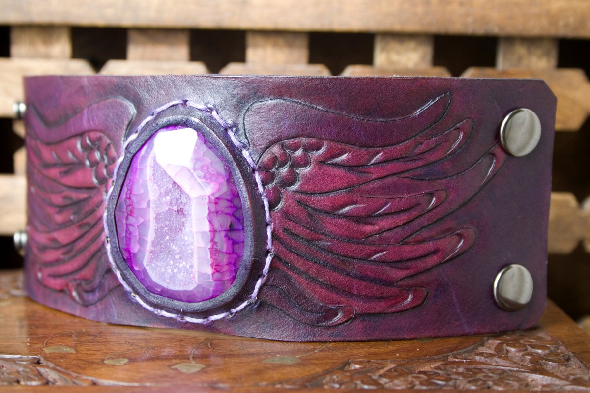 Beautiful large pink dragon vein druzy is the centre for this winged Free Spirit cuff
