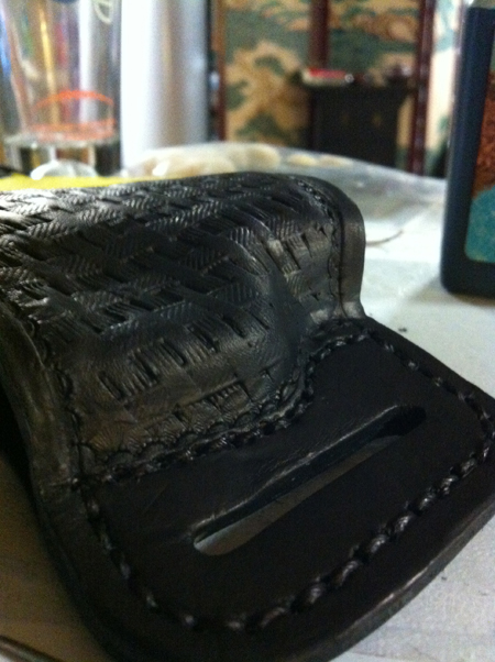 Used Eco Flo, Super Sheene finish. Took a couple coats. Leather sucked that stuff right in.