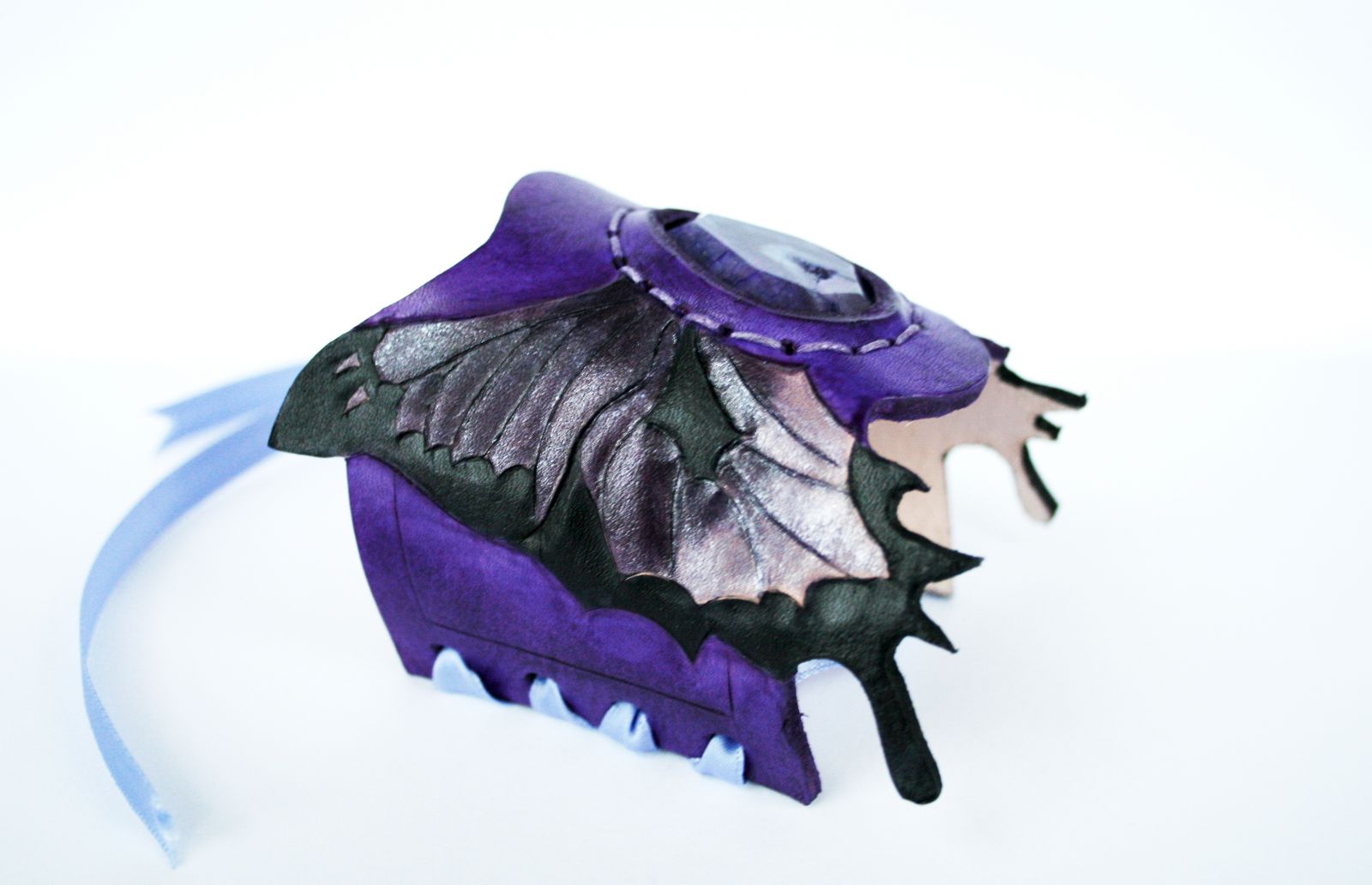 Handtooled leather butterfly cuff with purple dragon vein druzy cabochon, dyed in violet tones with shimmer added to dye on the wings
