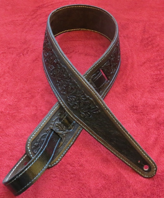 This guitar strap is 2.5 inches wide and 45 inches long. It can be adjusted out to 51 inches. The design is an interwoven scroll. The colour is black. The lining is a dark brown pigskin split suede. The edges are burnished and saddle stitched with white thread..