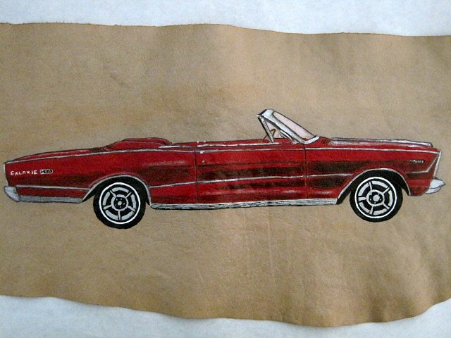 This classic, high performance 1966 Galaxie 7 Litre convertible is captured on a quality leather canvas which is 22" x 8 3/4" and hand painted. The "7 Litre" badges on grille & fenders hint strongly at what's under the hood-the mighty, new Thunderbird 428 V-8. It's 345 hp strong, with 4-barrel carb, hydraulic lifters & special dual, low restriction exhust.