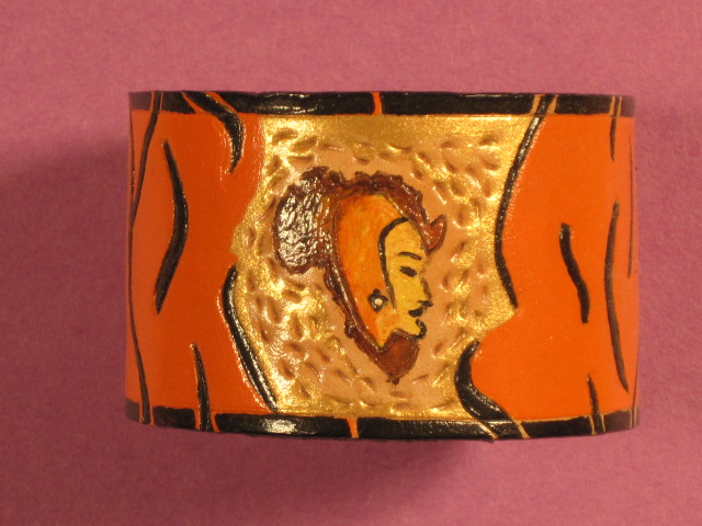 The facial background is the African Continent & the images are all hand carved into the leather.