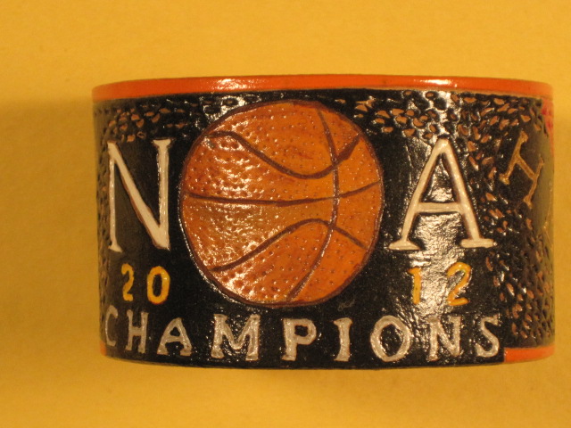 The NBA series scores are on the back-side as well as the name of the series MVP. This is a signed piece. The lettering is done with The Miami Heat colors & metallic Gold & Silver leather dye. As you can see, this bracelet is special