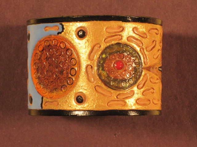 See video at http://youtu.be/BYJfg6OEfLc This custom, leather bracelet design shows the Aztec and Native American influence. Each design was done by hand using special tools that I made. The bracelet measures 6 1/4" in circumference when closed and 1 1/2" in width. This is a signed piece. Has a waterproof & UV protective coating & a high gloss finish.