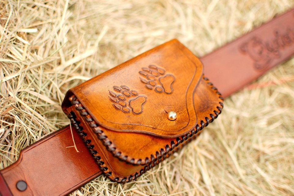 Slider pouch with bear motif and brass stud closure.