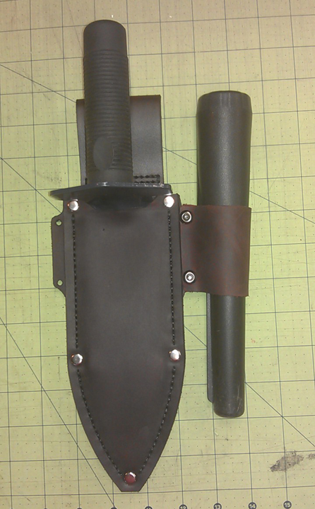 I designed and made a metal detecting sheath in an ambidextrous configuration to carry the popular style of diggers and pinpointers. Made from brown oil stoned leather. Hand stitched.