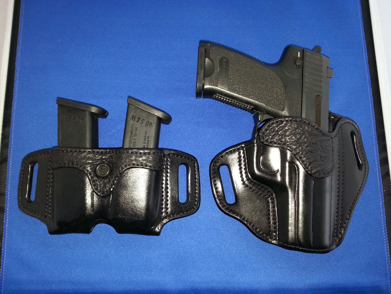 Full Size USP 40 Belt slide and double mag. This holster had side guard, speed cut, shark accent, and the customer had a newly finished gun so it has a liner. Double mag also had shark accent.