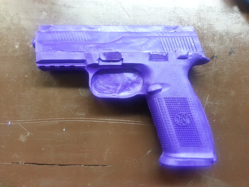 FNH FNS-9 trigger guard filled, sight track built up, safety molded for on and off carry, magazine loaded to put the slide lock in the right position.