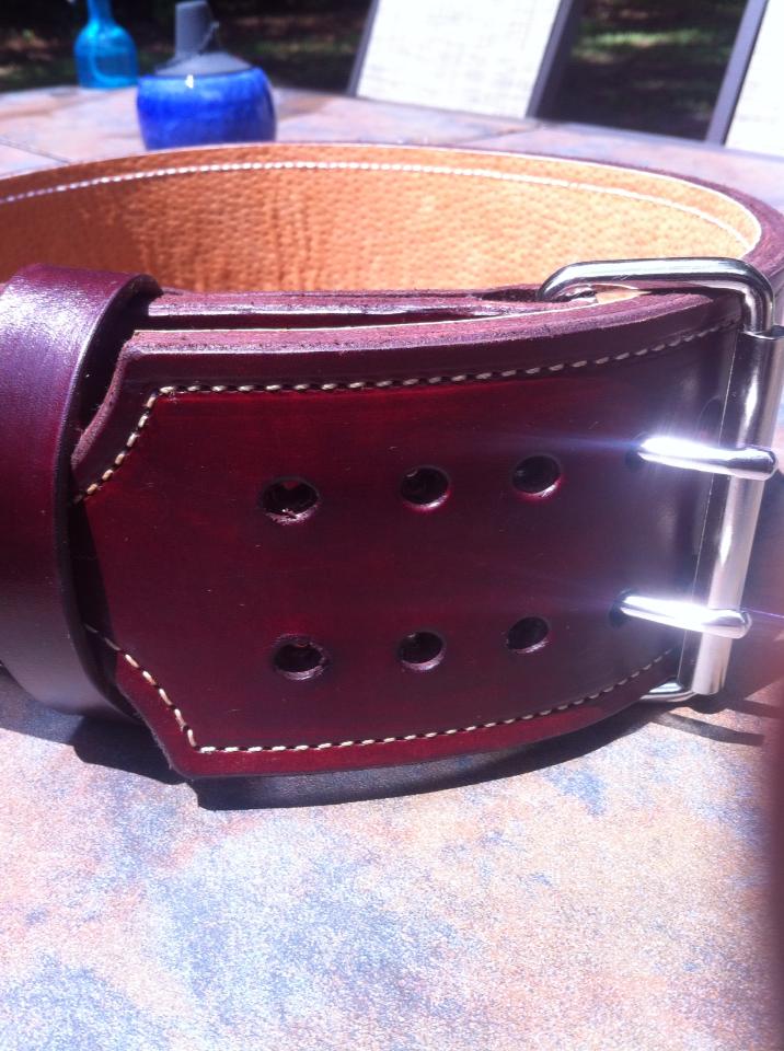 A friend of mine owns a Crossfit gym (The Anvil), and asked me to make them some weight lifting belts. This is the first, of hopefully many! It is 4 inches wide and about 40 inches long. 10mm thick. Lined with pig skin.