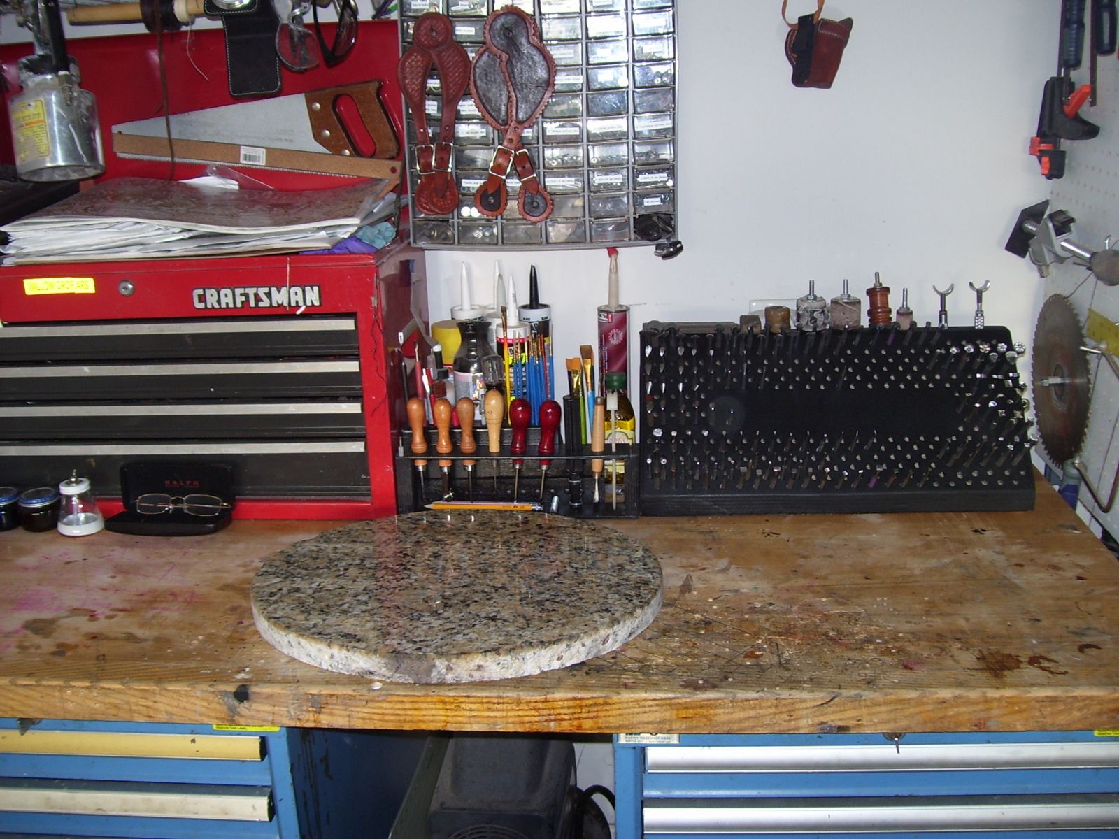 My work area for stamping, carving, dyeing, burnishing, etc.