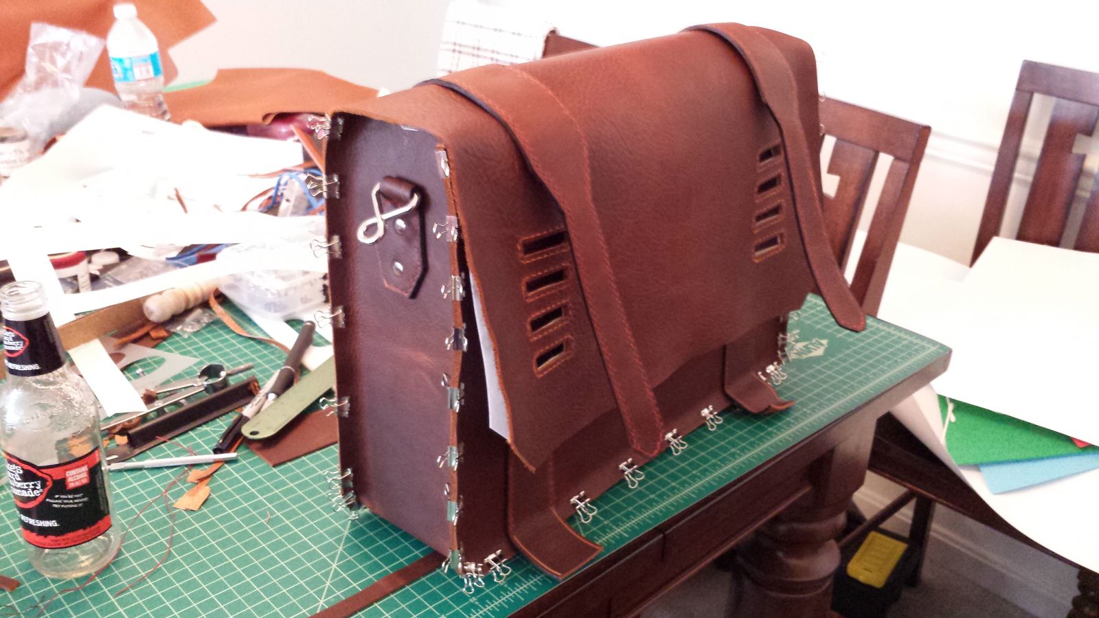 Another mock up on the bag, this time the straps are sewn on, the closure system holes are cut, and the D ring attachments are sewn on. The small strops of leather on the bottom will be wrapped under and sewn back on itself to act as sort of feet for the bag.